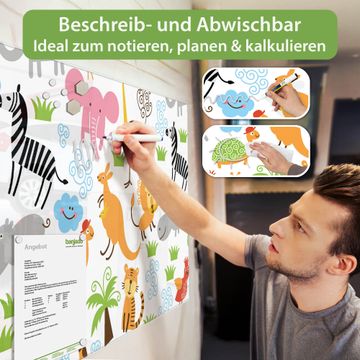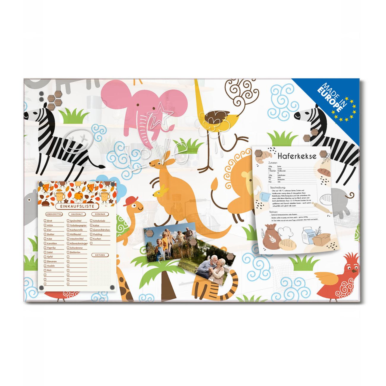 Ein Stück Design, das Ihren Alltag organisiert. Schreiben, heften, inspirieren - alles an einem Ort. Qualität, die man spürt. Montage leicht gemacht. Handwerk mit Herz - veredelt in Sachsen. Einzigartiges Design mit Motiv Motiv Fröhliche Tiere Beschreibbare Glasoberfläche, leicht zu reinigen Starke Magnetkraft durch Stahlrückwand Inklusive 4 Neodym-Magneten Flexible Montageoptionen Handveredelt in Sachsen - Qualität, die bleibt