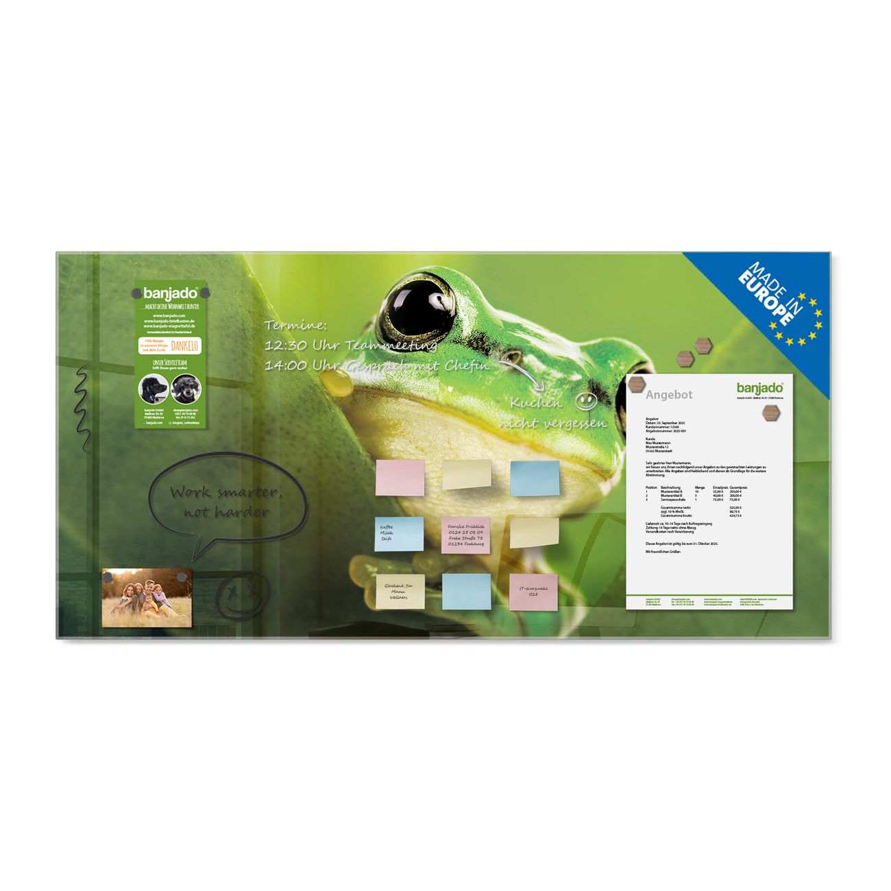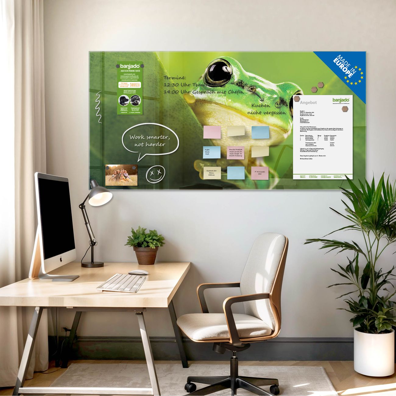 Jede Glas Magnettafel wird in unserer Werkstatt von Hand gefertigt und sorgfältig geprüft. So erhalten Sie ein echtes Qualitätsprodukt, das Funktion und Ästhetik perfekt vereint.?? Warum banjado?