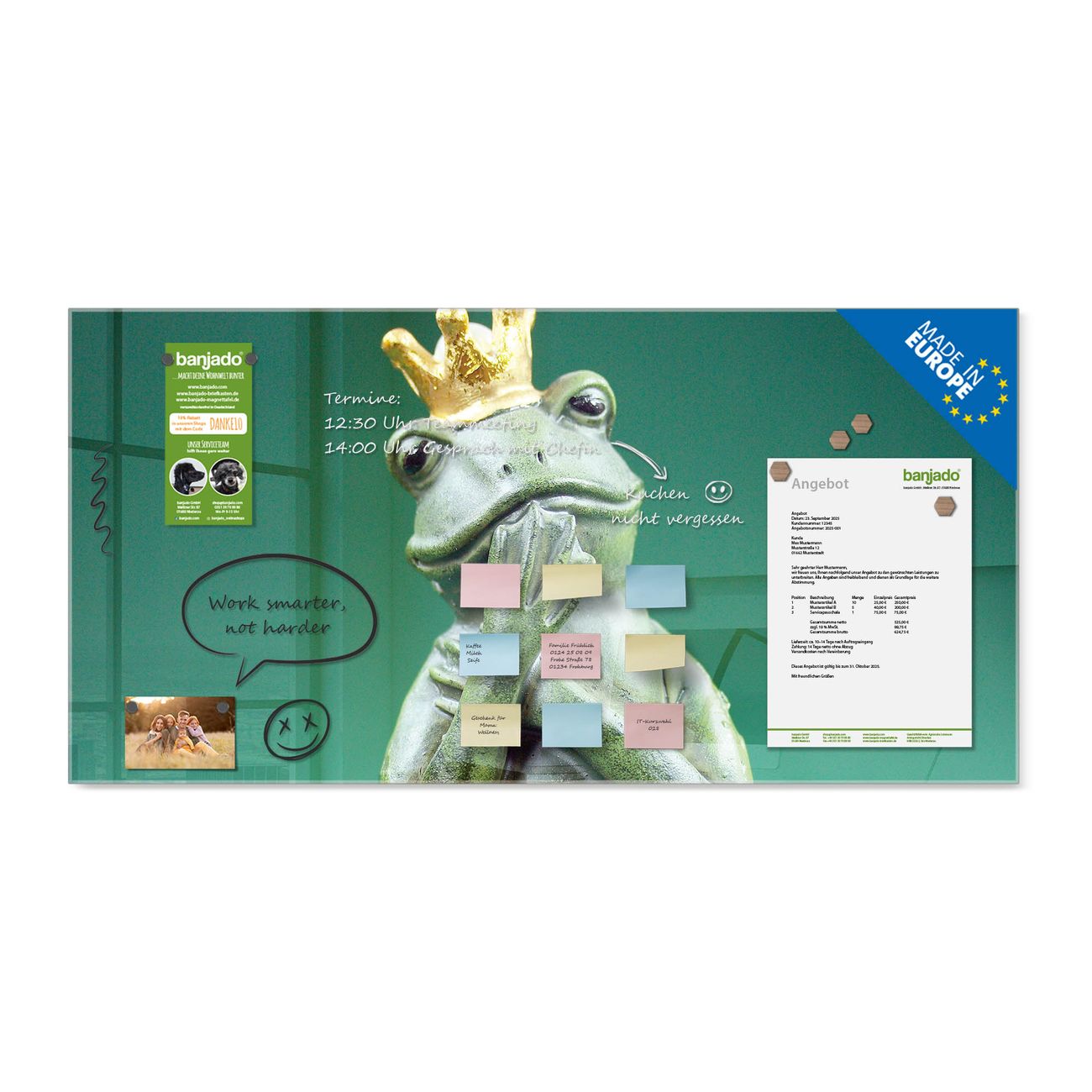 Jede Glas Magnettafel wird in unserer Werkstatt von Hand gefertigt und sorgfältig geprüft. So erhalten Sie ein echtes Qualitätsprodukt, das Funktion und Ästhetik perfekt vereint.?? Warum banjado?