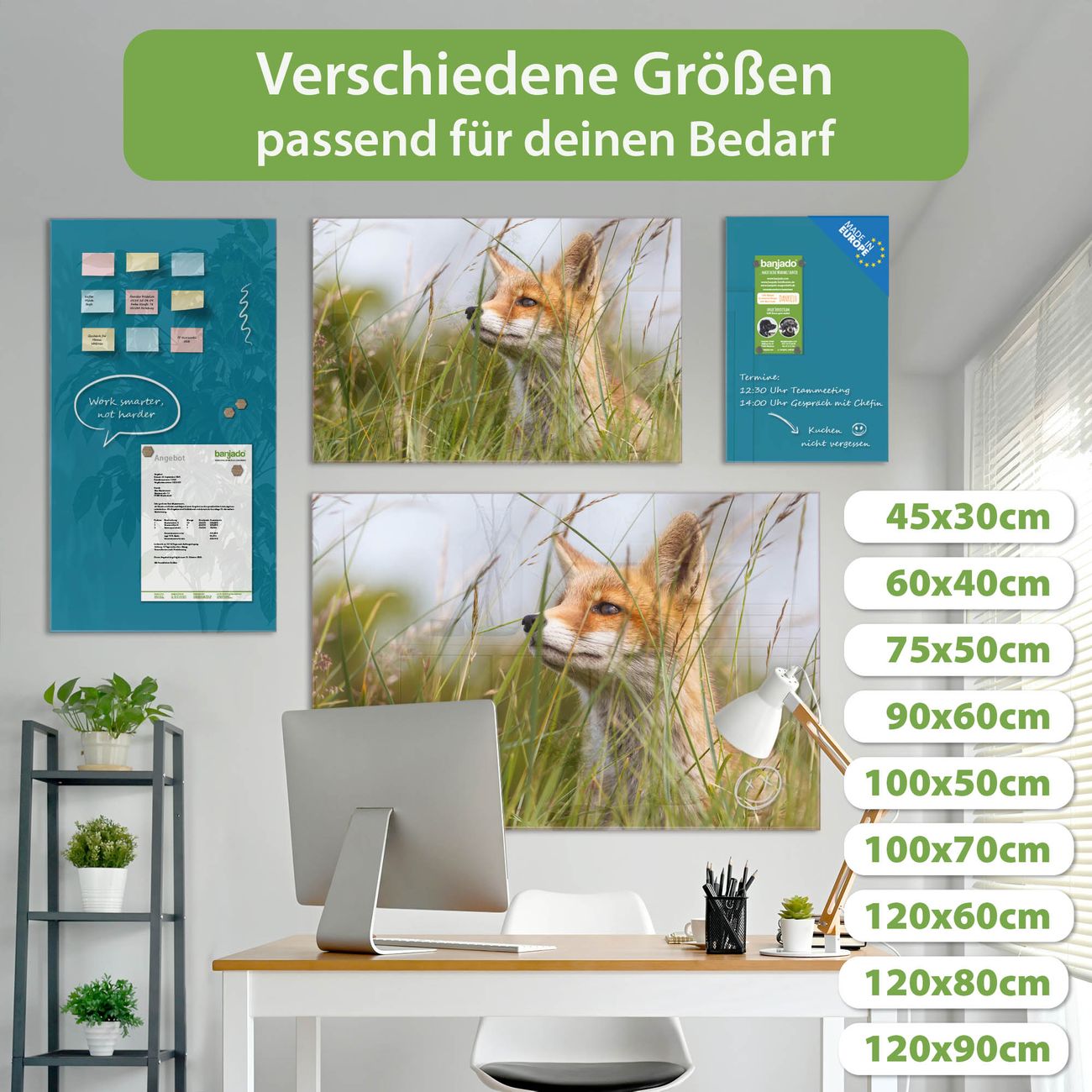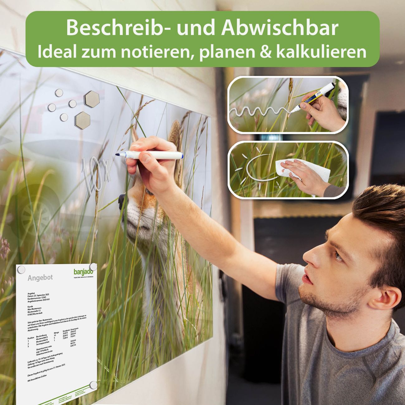 Die banjado Glas Magnettafel mit dem Motiv Motiv Fuchs verbindet Funktionalität mit Stil. Sie ersetzt das Zettelchaos durch klare Strukturen und bringt dabei eine warme, natürliche Atmosphäre in Ihr Zuhause. Ob im Büro, in der Küche oder im Eingangsbereich - dieses Design-Board zieht Blicke an und sorgt für Ordnung mit Charakter.
