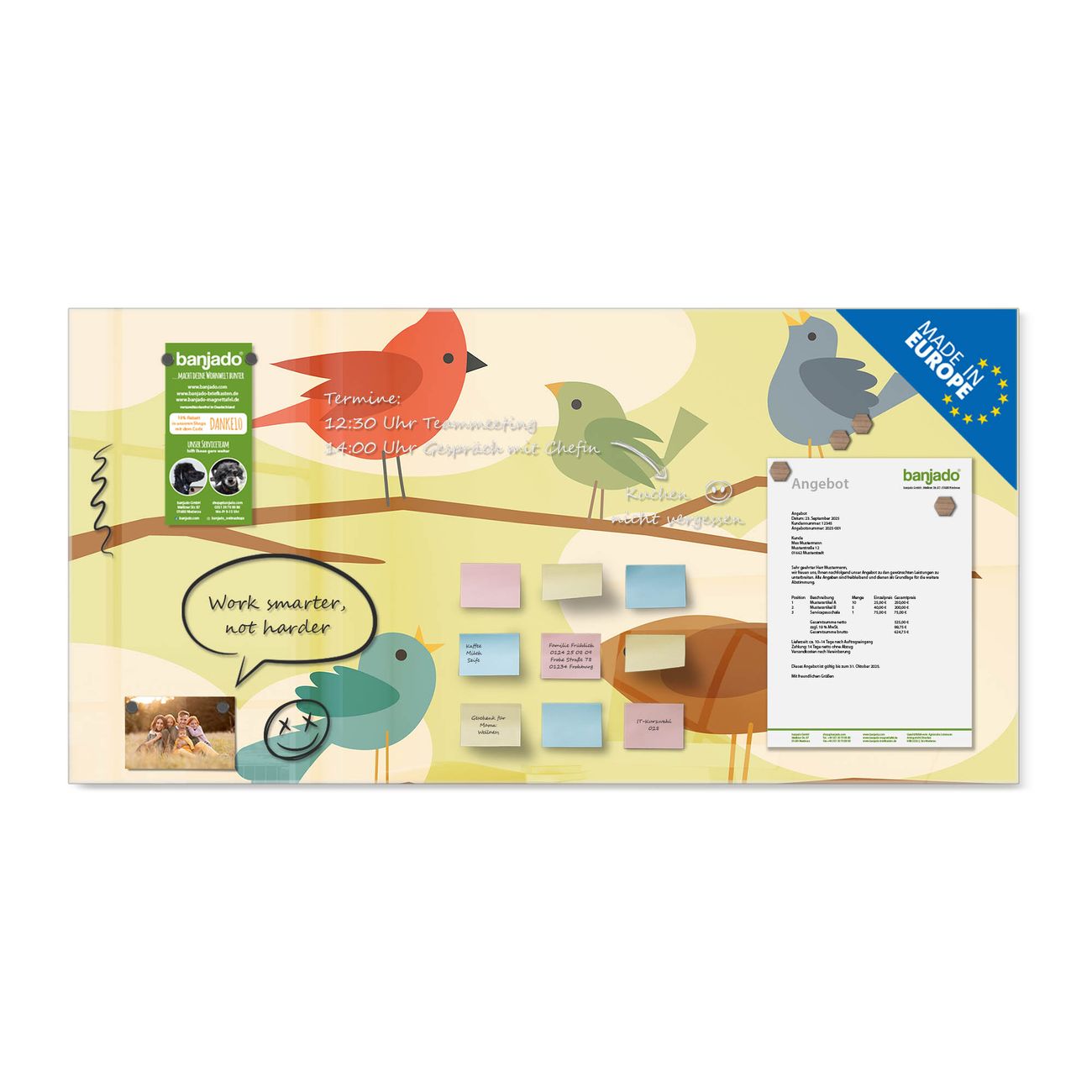 Ein Stück Design, das Ihren Alltag organisiert. Schreiben, heften, inspirieren - alles an einem Ort. Qualität, die man spürt. Montage leicht gemacht. Handwerk mit Herz - veredelt in Sachsen. Einzigartiges Design mit Motiv Motiv Fünf Vögel Beschreibbare Glasoberfläche, leicht zu reinigen Starke Magnetkraft durch Stahlrückwand Inklusive 4 Neodym-Magneten Flexible Montageoptionen Handveredelt in Sachsen - Qualität, die bleibt