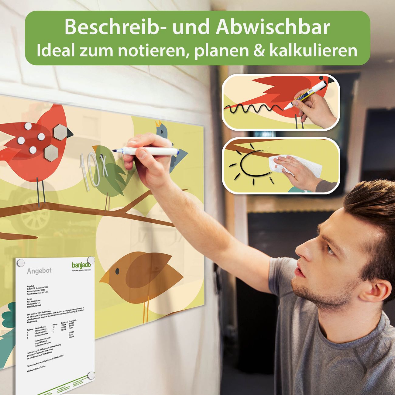 Jede Glas Magnettafel wird in unserer Werkstatt von Hand gefertigt und sorgfältig geprüft. So erhalten Sie ein echtes Qualitätsprodukt, das Funktion und Ästhetik perfekt vereint.?? Warum banjado?