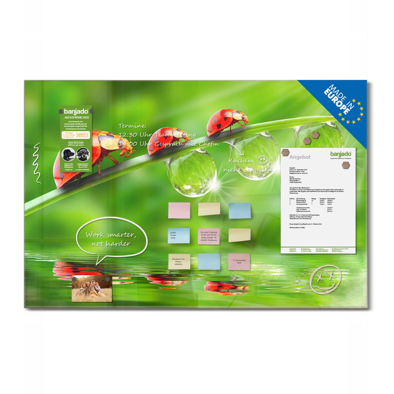 Jede Glas Magnettafel wird in unserer Werkstatt von Hand gefertigt und sorgfältig geprüft. So erhalten Sie ein echtes Qualitätsprodukt, das Funktion und Ästhetik perfekt vereint.?? Warum banjado?