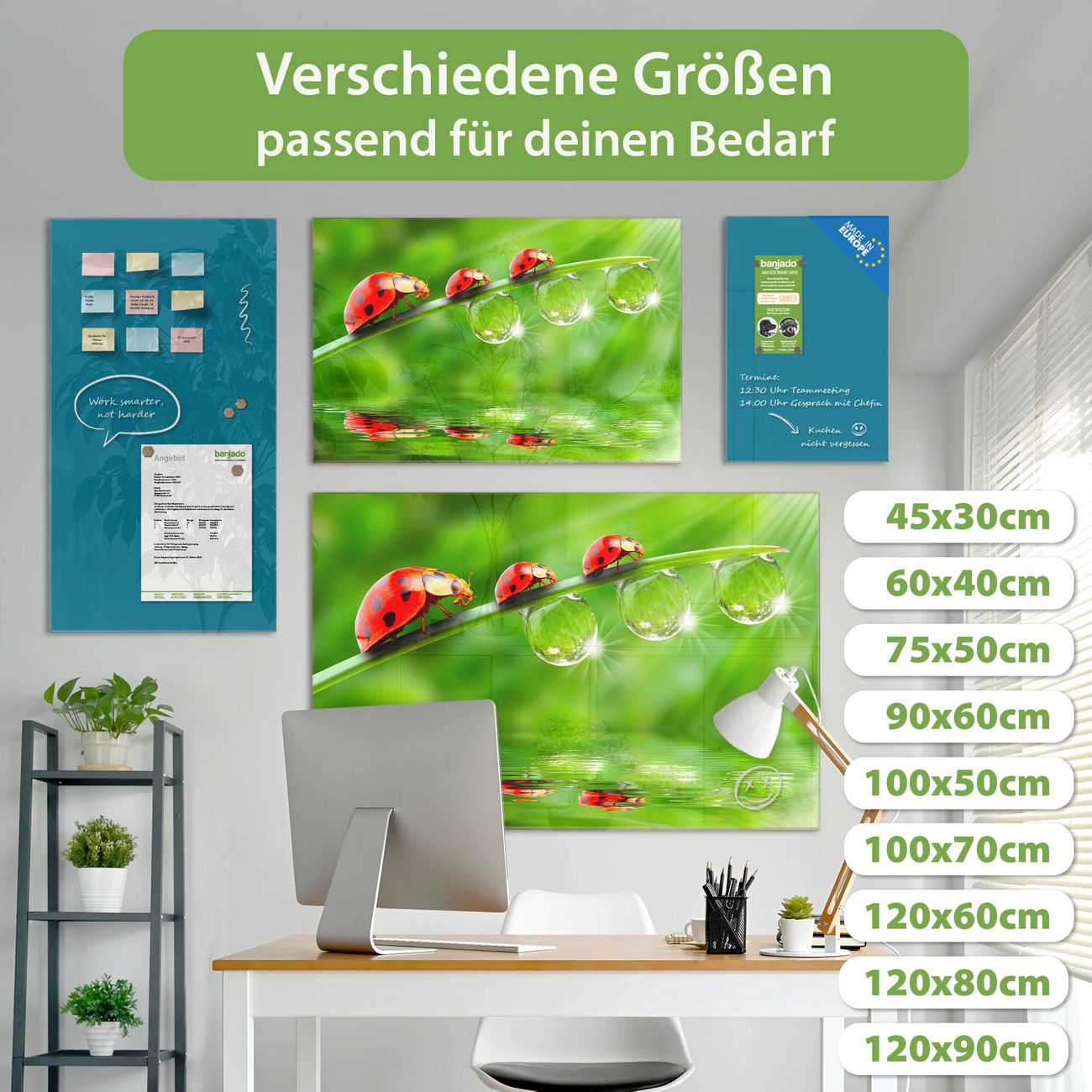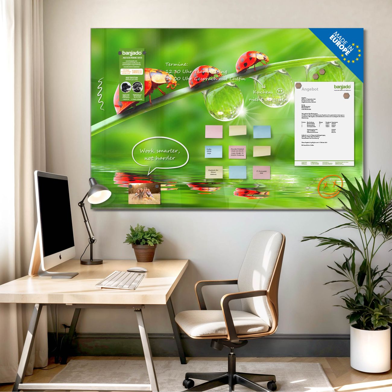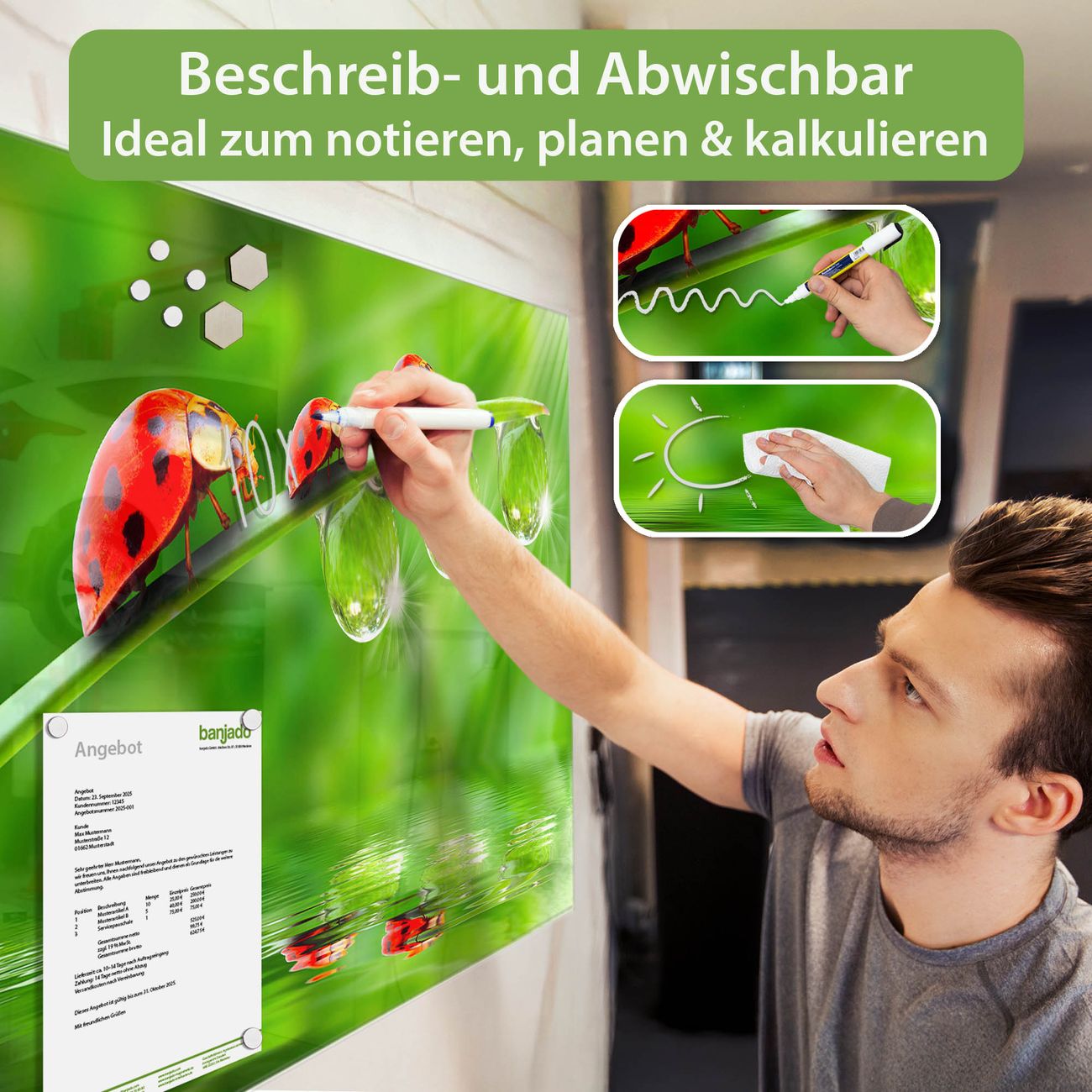 Jede Glas Magnettafel wird in unserer Werkstatt von Hand gefertigt und sorgfältig geprüft. So erhalten Sie ein echtes Qualitätsprodukt, das Funktion und Ästhetik perfekt vereint.?? Warum banjado?