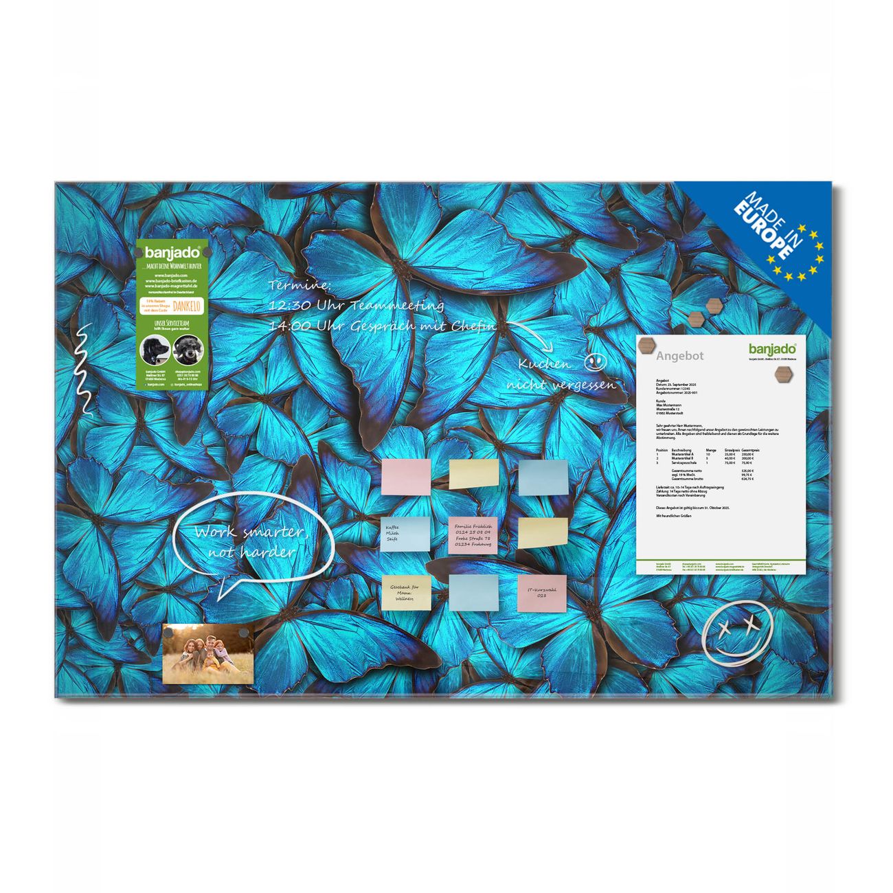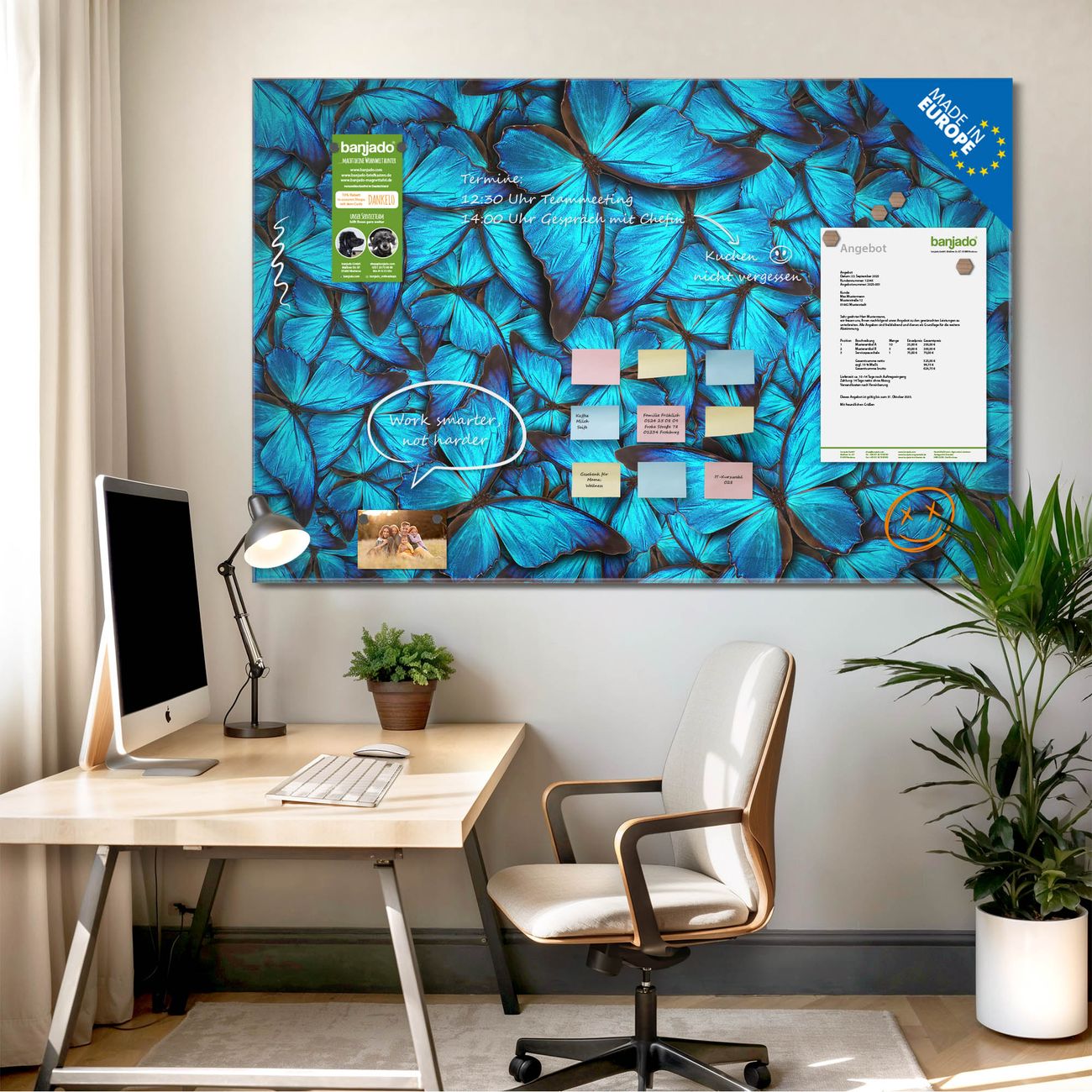 Jede Glas Magnettafel wird in unserer Werkstatt von Hand gefertigt und sorgfältig geprüft. So erhalten Sie ein echtes Qualitätsprodukt, das Funktion und Ästhetik perfekt vereint.?? Warum banjado?