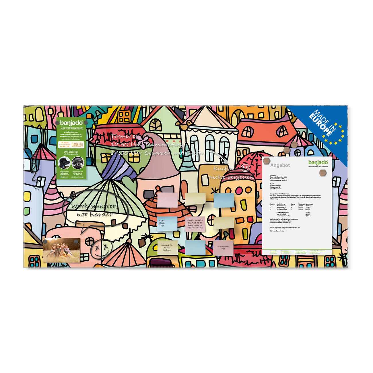 Ein Stück Design, das Ihren Alltag organisiert. Schreiben, heften, inspirieren - alles an einem Ort. Qualität, die man spürt. Montage leicht gemacht. Handwerk mit Herz - veredelt in Sachsen. Einzigartiges Design mit Motiv Motiv Funky Town Beschreibbare Glasoberfläche, leicht zu reinigen Starke Magnetkraft durch Stahlrückwand Inklusive 4 Neodym-Magneten Flexible Montageoptionen Handveredelt in Sachsen - Qualität, die bleibt