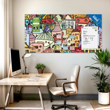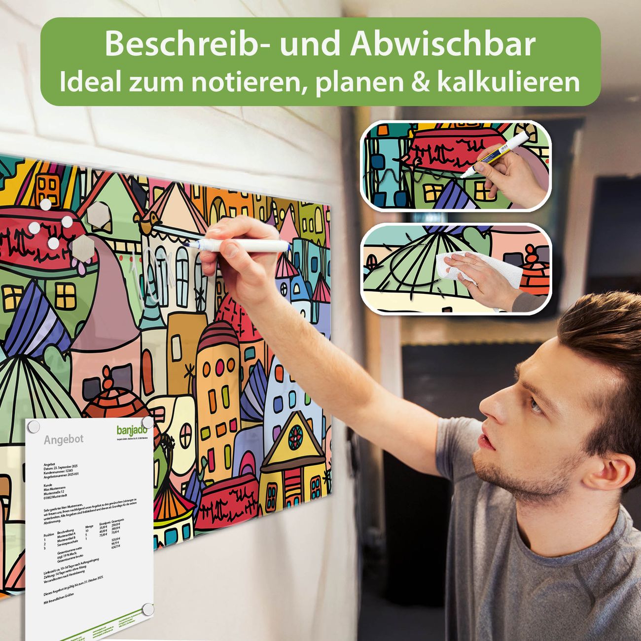 Die banjado Glas Magnettafel mit dem Motiv Motiv Funky Town verbindet Funktionalität mit Stil. Sie ersetzt das Zettelchaos durch klare Strukturen und bringt dabei eine warme, natürliche Atmosphäre in Ihr Zuhause. Ob im Büro, in der Küche oder im Eingangsbereich - dieses Design-Board zieht Blicke an und sorgt für Ordnung mit Charakter.
