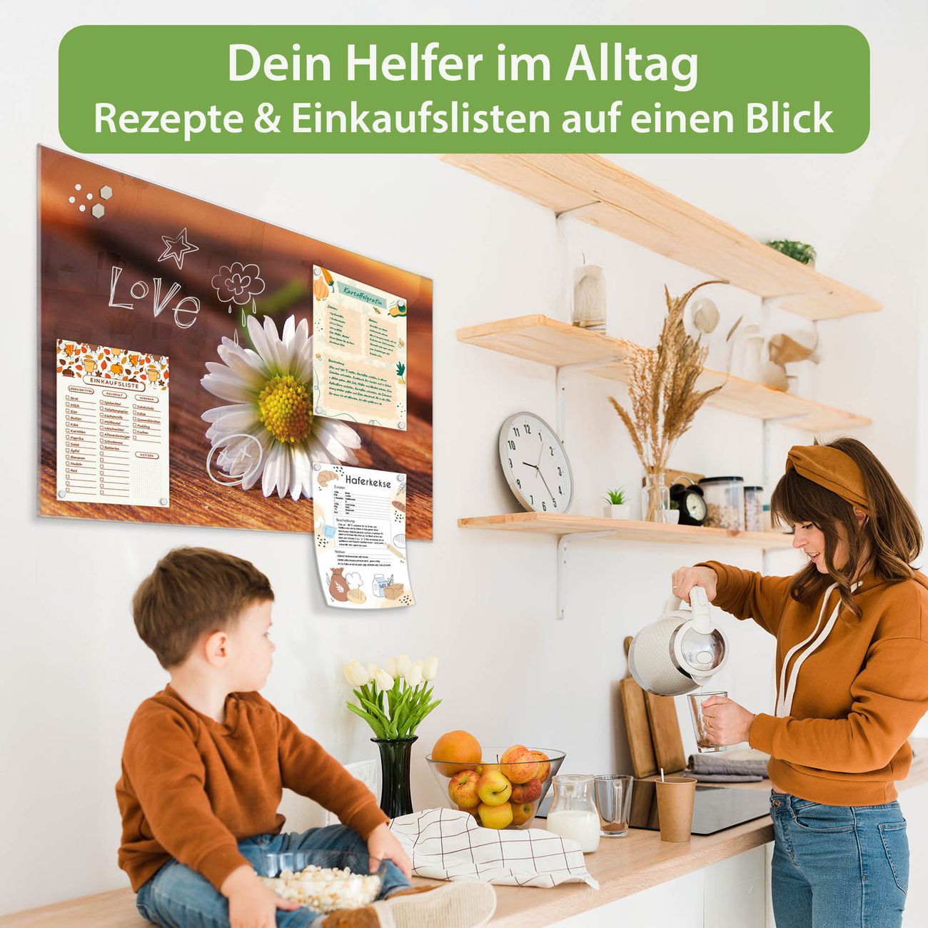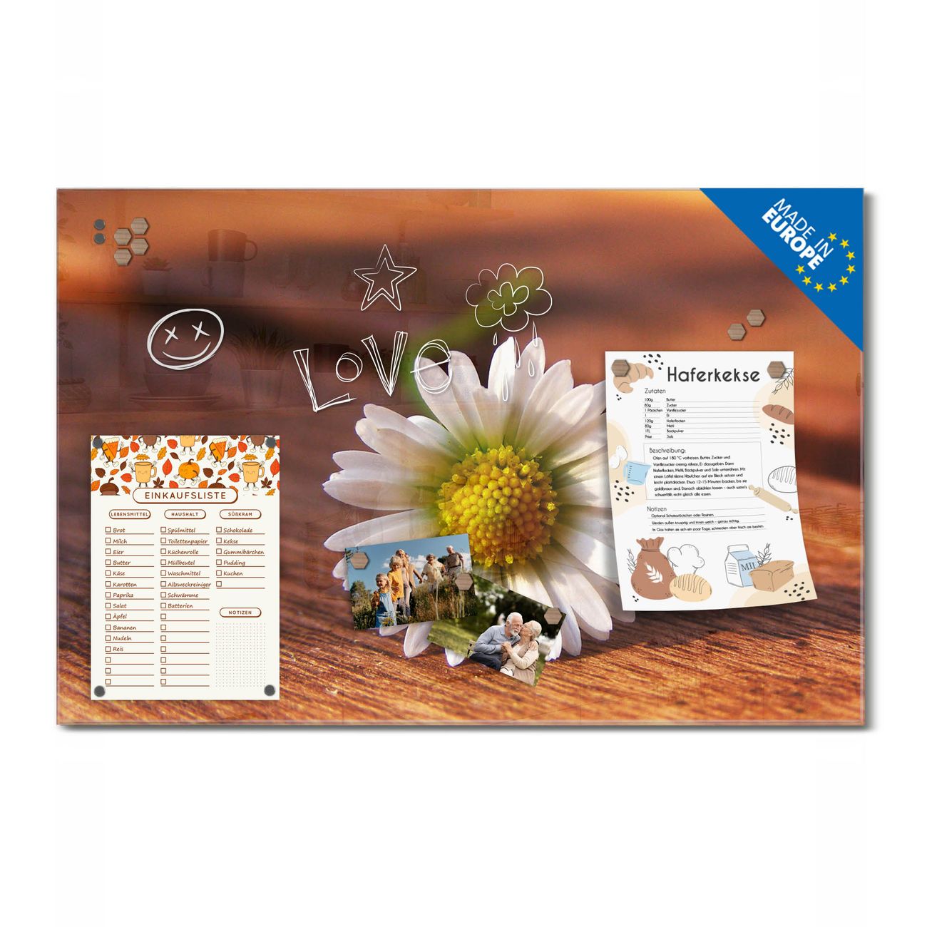 Ein Stück Design, das Ihren Alltag organisiert. Schreiben, heften, inspirieren - alles an einem Ort. Qualität, die man spürt. Montage leicht gemacht. Handwerk mit Herz - veredelt in Sachsen. Einzigartiges Design mit Motiv Motiv Gänseblümchen Beschreibbare Glasoberfläche, leicht zu reinigen Starke Magnetkraft durch Stahlrückwand Inklusive 4 Neodym-Magneten Flexible Montageoptionen Handveredelt in Sachsen - Qualität, die bleibt