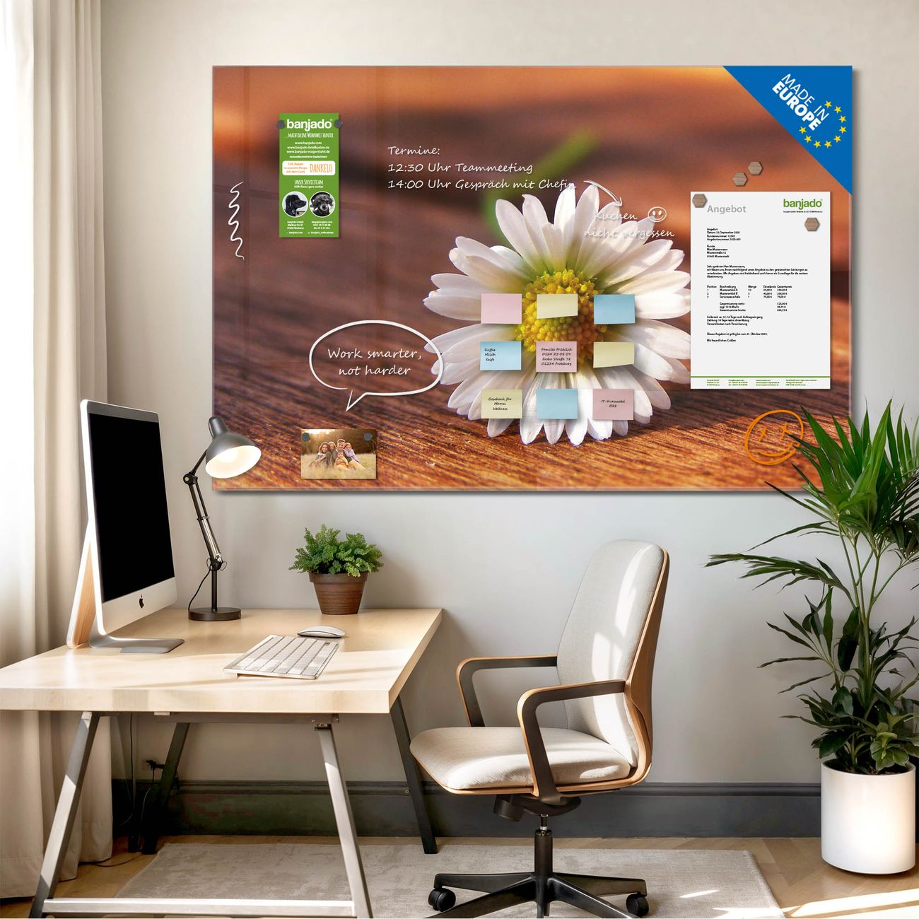 Jede Glas Magnettafel wird in unserer Werkstatt von Hand gefertigt und sorgfältig geprüft. So erhalten Sie ein echtes Qualitätsprodukt, das Funktion und Ästhetik perfekt vereint.?? Warum banjado?