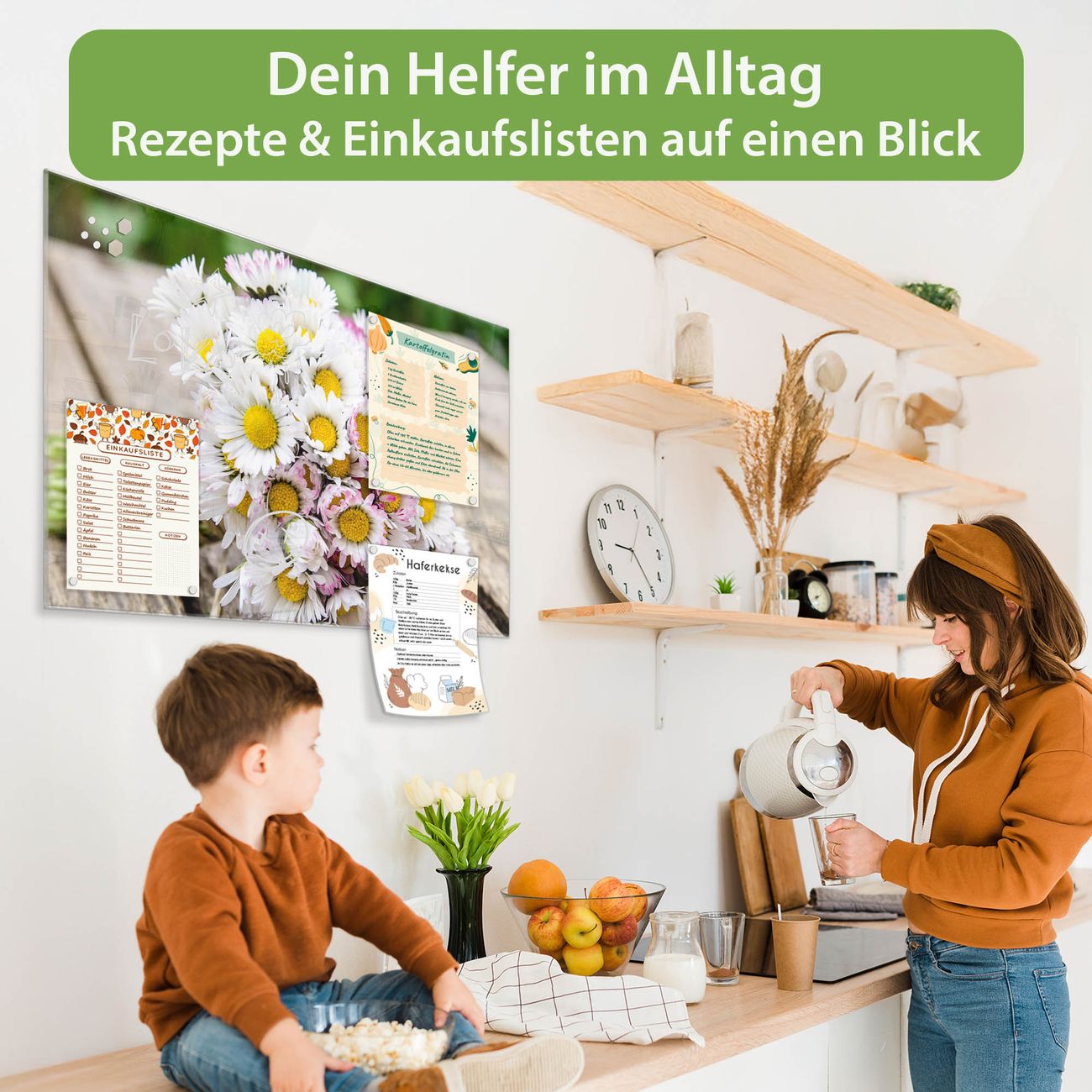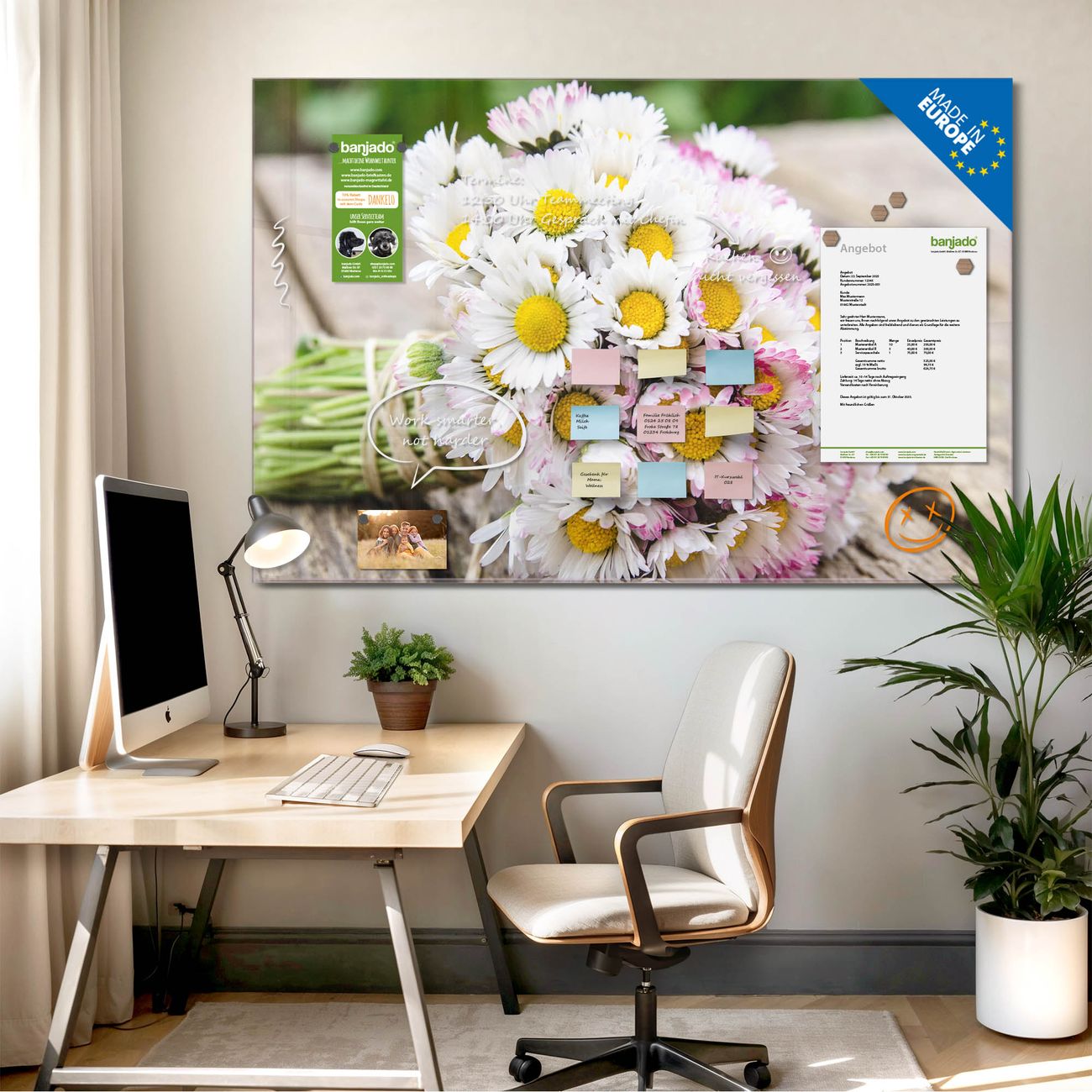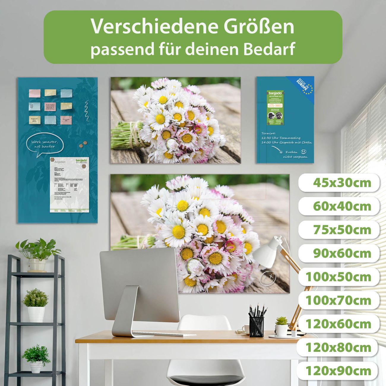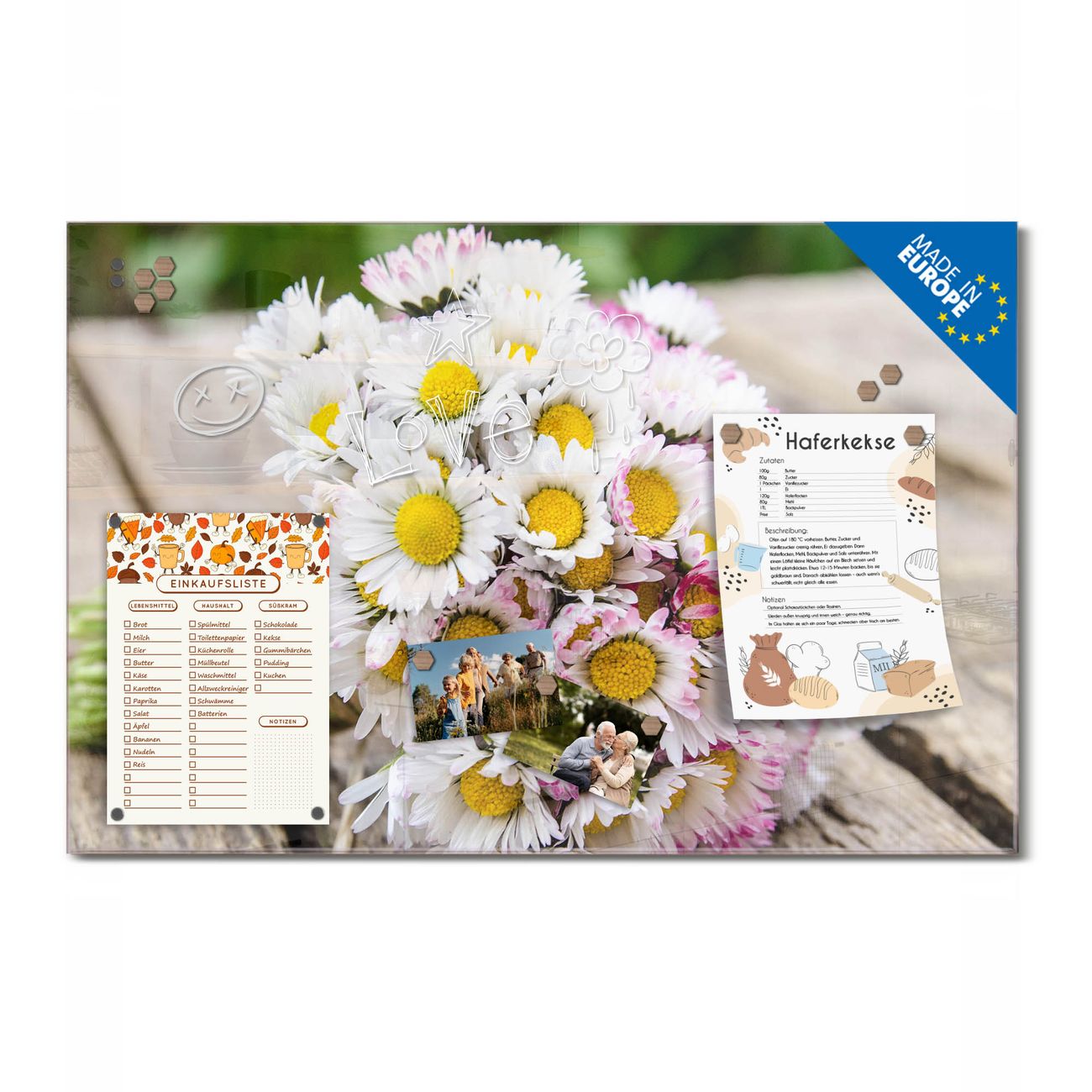 Ein Stück Design, das Ihren Alltag organisiert. Schreiben, heften, inspirieren - alles an einem Ort. Qualität, die man spürt. Montage leicht gemacht. Handwerk mit Herz - veredelt in Sachsen. Einzigartiges Design mit Motiv Motiv Strauß Gänseblümchen Beschreibbare Glasoberfläche, leicht zu reinigen Starke Magnetkraft durch Stahlrückwand Inklusive 4 Neodym-Magneten Flexible Montageoptionen Handveredelt in Sachsen - Qualität, die bleibt