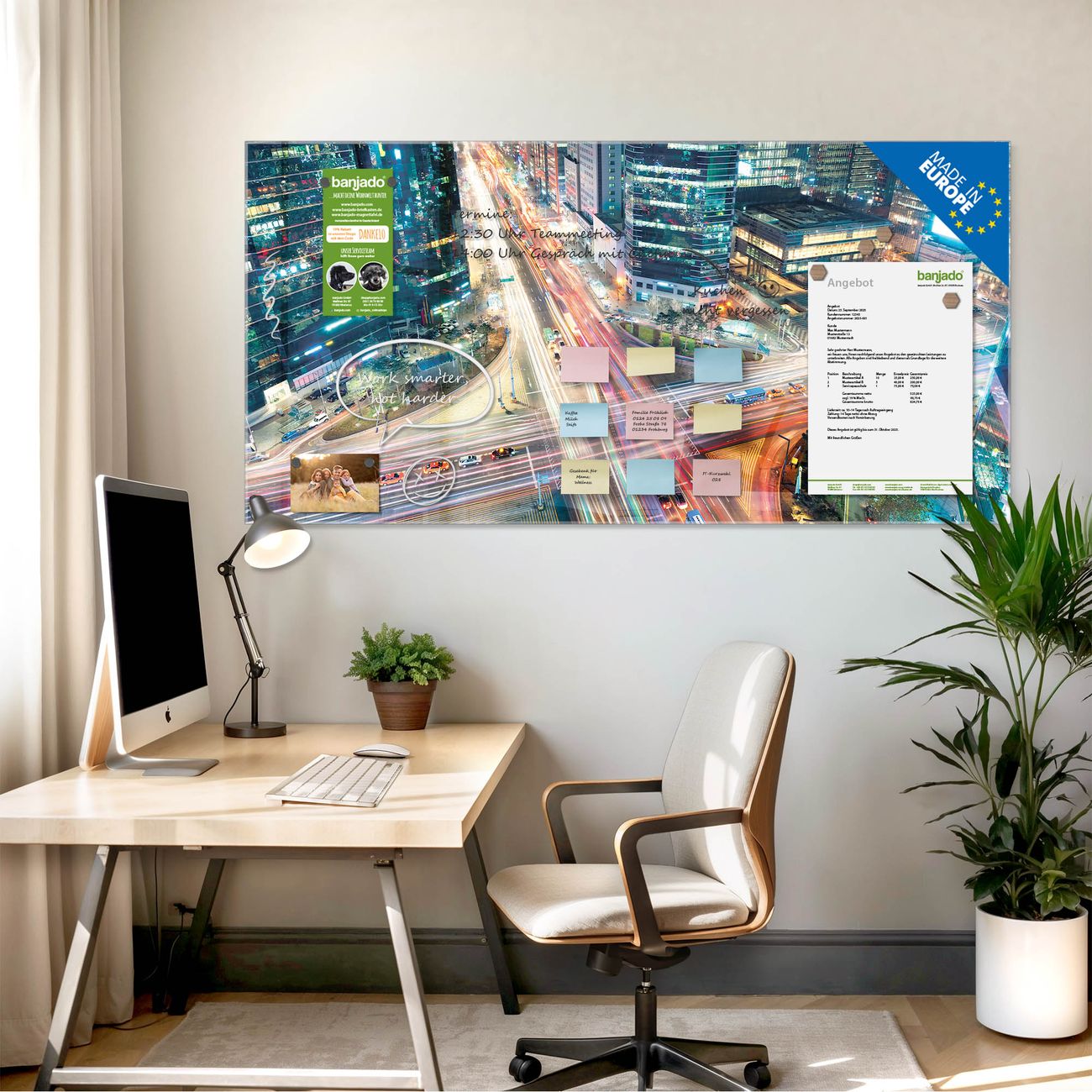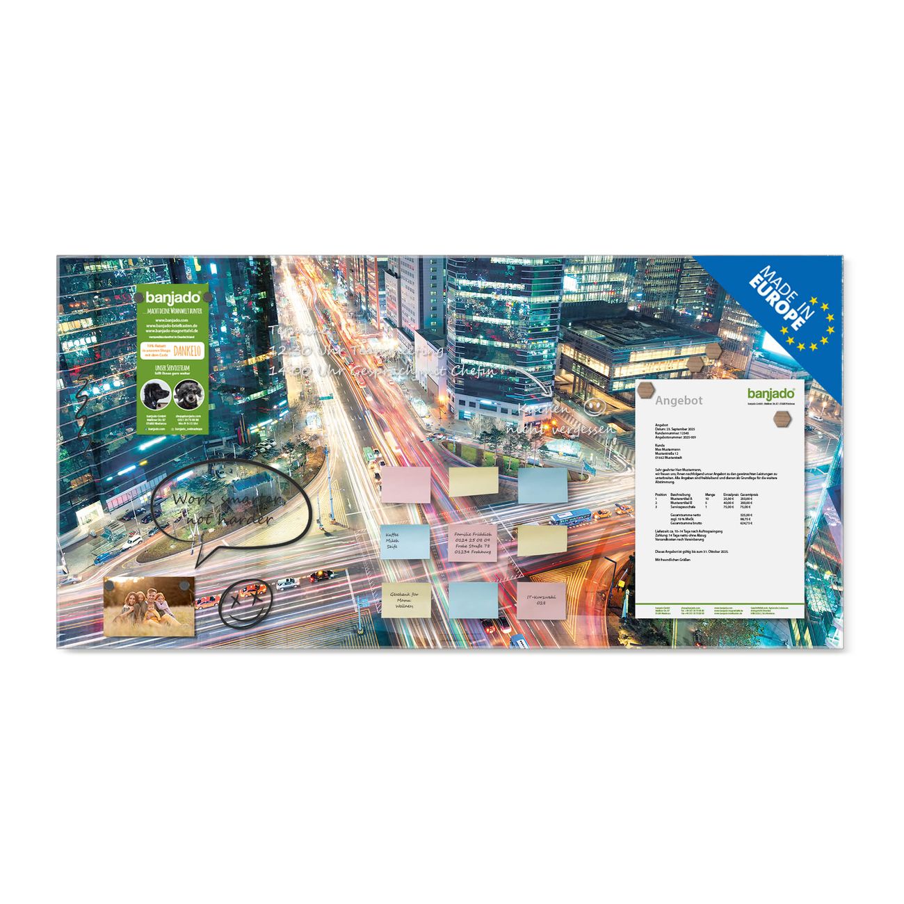 Jede Glas Magnettafel wird in unserer Werkstatt von Hand gefertigt und sorgfältig geprüft. So erhalten Sie ein echtes Qualitätsprodukt, das Funktion und Ästhetik perfekt vereint.?? Warum banjado?