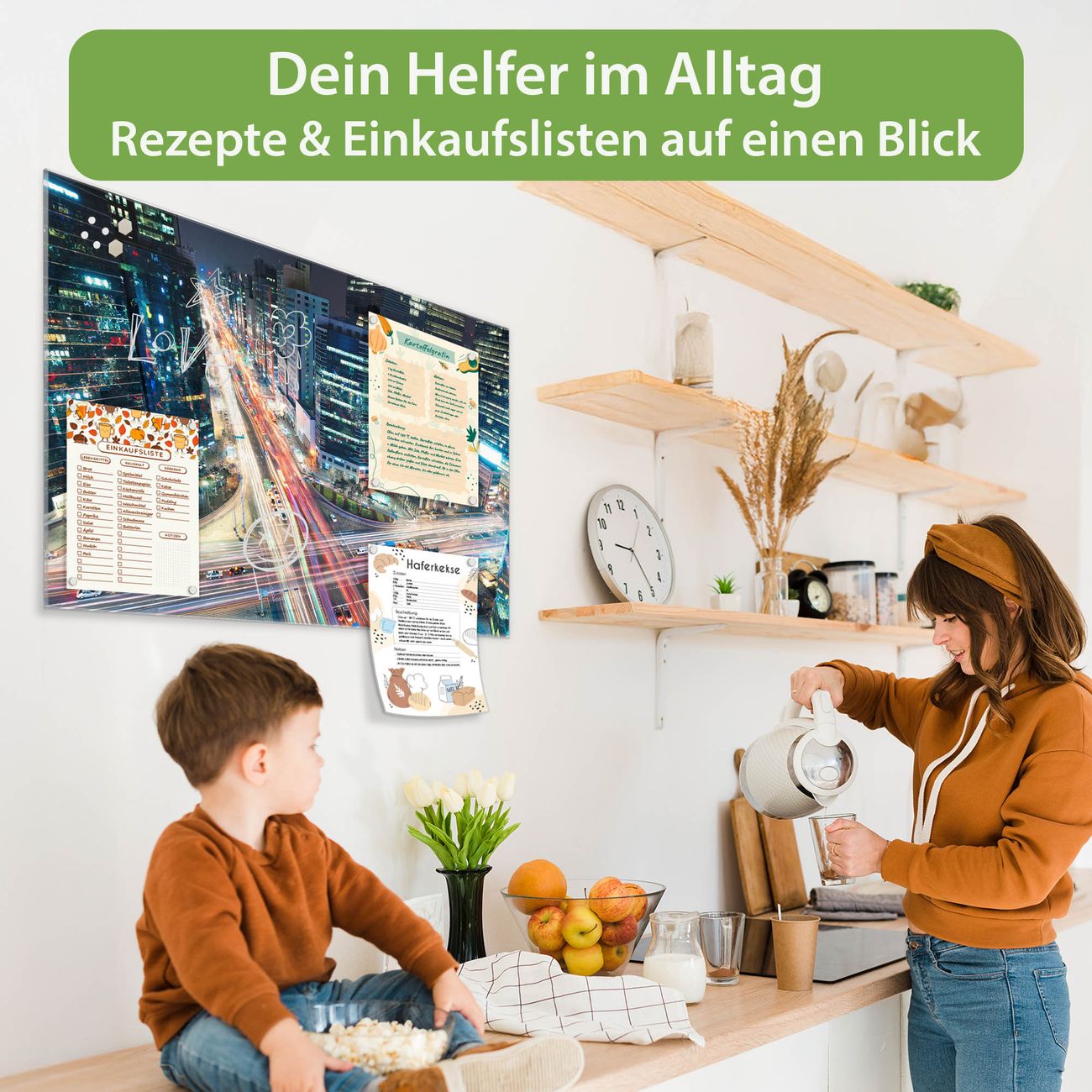 Auf der glatten Glasoberfläche lassen sich Termine, Rezepte oder Notizen ganz einfach mit Kreidestiften festhalten und rückstandslos entfernen. Starke Neodym-Magnete halten Ihre wichtigsten Erinnerungen sicher an Ort und Stelle. So entsteht Ihre ganz persönliche Ideenwand - jeden Tag neu.