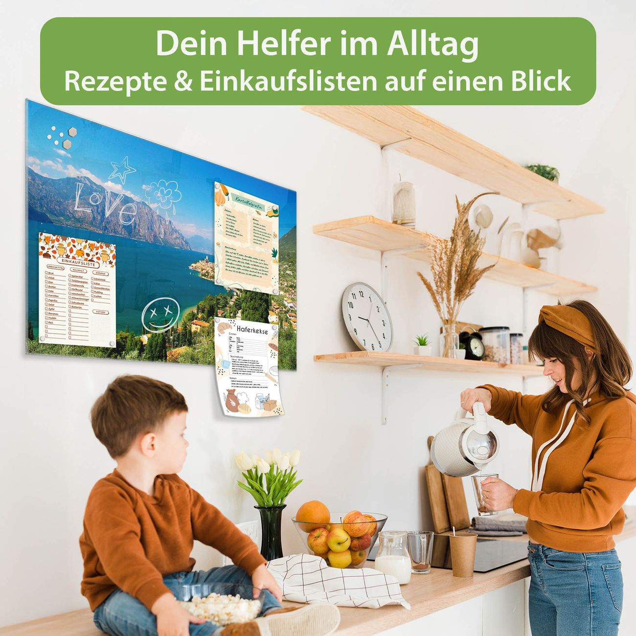 Ein Stück Design, das Ihren Alltag organisiert. Schreiben, heften, inspirieren - alles an einem Ort. Qualität, die man spürt. Montage leicht gemacht. Handwerk mit Herz - veredelt in Sachsen. Einzigartiges Design mit Motiv Motiv Gardasee Beschreibbare Glasoberfläche, leicht zu reinigen Starke Magnetkraft durch Stahlrückwand Inklusive 4 Neodym-Magneten Flexible Montageoptionen Handveredelt in Sachsen - Qualität, die bleibt
