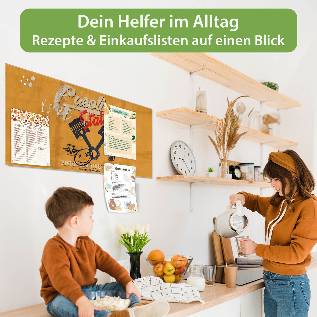 Auf der glatten Glasoberfläche lassen sich Termine, Rezepte oder Notizen ganz einfach mit Kreidestiften festhalten und rückstandslos entfernen. Starke Neodym-Magnete halten Ihre wichtigsten Erinnerungen sicher an Ort und Stelle. So entsteht Ihre ganz persönliche Ideenwand - jeden Tag neu.