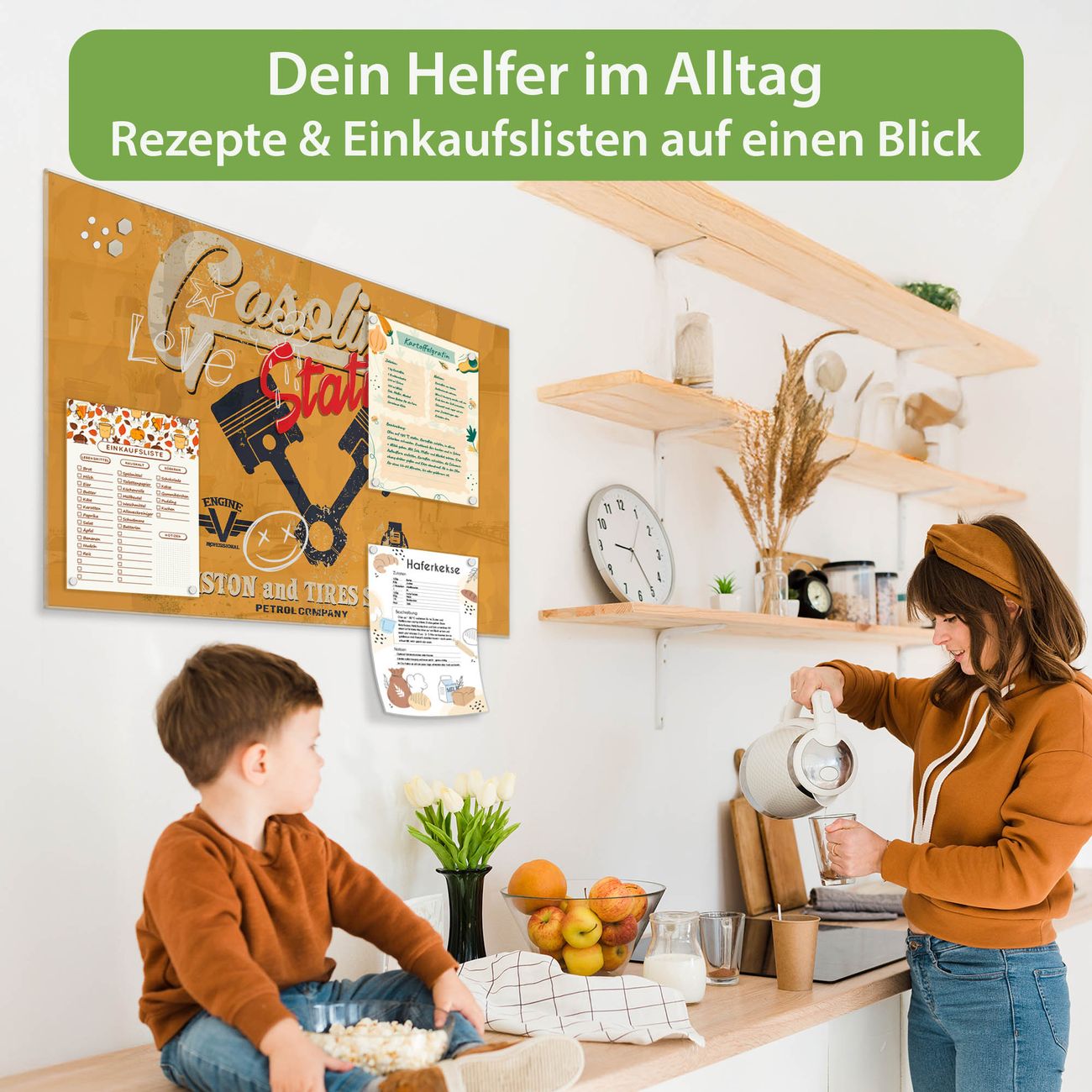 Ein Stück Design, das Ihren Alltag organisiert. Schreiben, heften, inspirieren - alles an einem Ort. Qualität, die man spürt. Montage leicht gemacht. Handwerk mit Herz - veredelt in Sachsen. Einzigartiges Design mit Motiv Motiv Gasoline Station Beschreibbare Glasoberfläche, leicht zu reinigen Starke Magnetkraft durch Stahlrückwand Inklusive 4 Neodym-Magneten Flexible Montageoptionen Handveredelt in Sachsen - Qualität, die bleibt