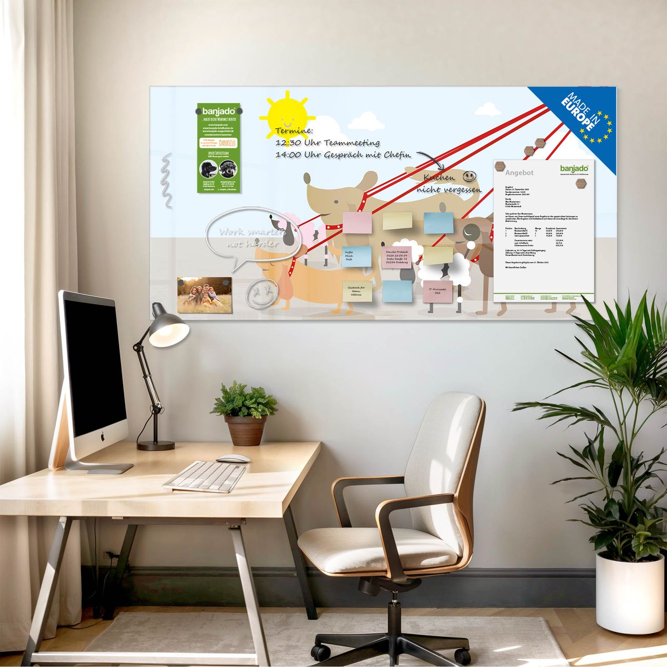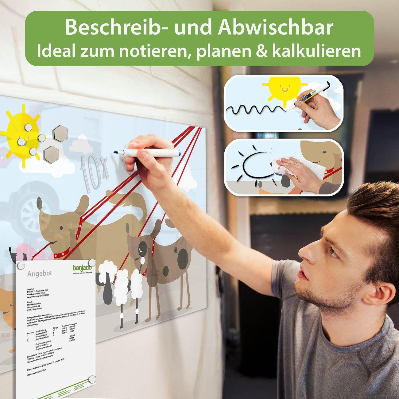 Jede Glas Magnettafel wird in unserer Werkstatt von Hand gefertigt und sorgfältig geprüft. So erhalten Sie ein echtes Qualitätsprodukt, das Funktion und Ästhetik perfekt vereint.?? Warum banjado?