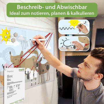 Auf der glatten Glasoberfläche lassen sich Termine, Rezepte oder Notizen ganz einfach mit Kreidestiften festhalten und rückstandslos entfernen. Starke Neodym-Magnete halten Ihre wichtigsten Erinnerungen sicher an Ort und Stelle. So entsteht Ihre ganz persönliche Ideenwand - jeden Tag neu.