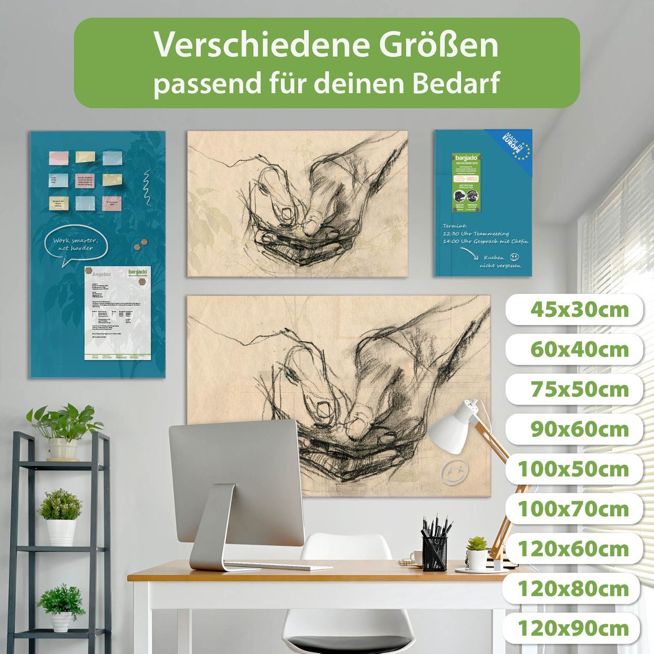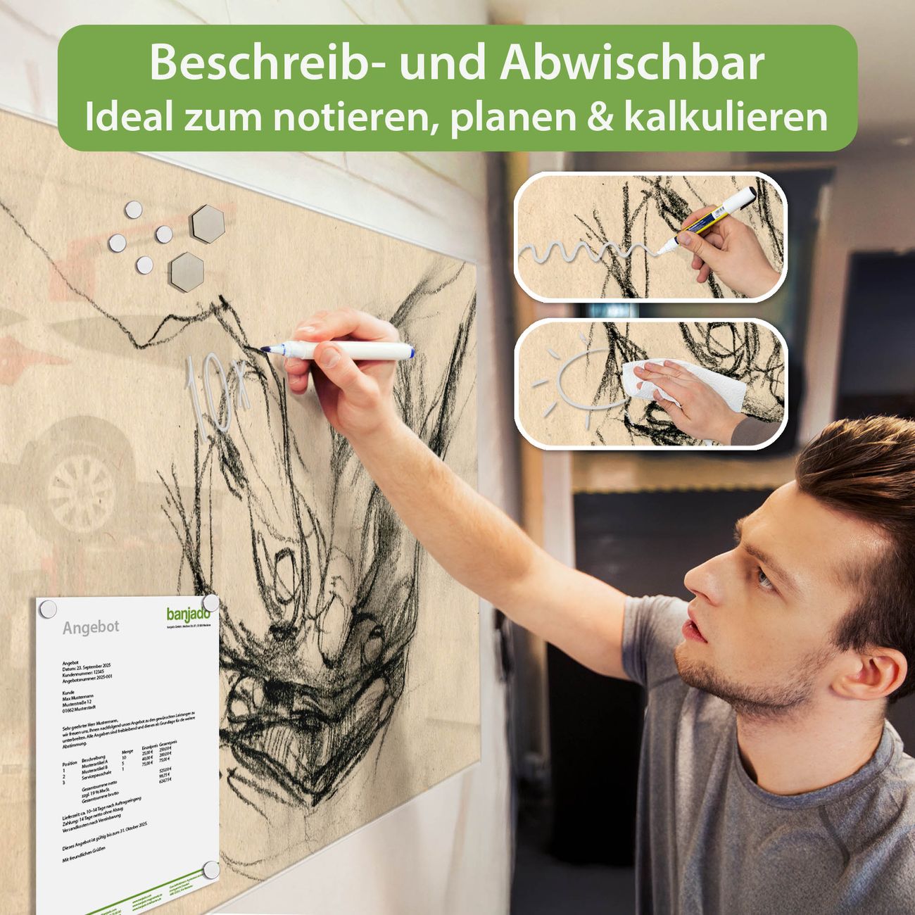 Jede Glas Magnettafel wird in unserer Werkstatt von Hand gefertigt und sorgfältig geprüft. So erhalten Sie ein echtes Qualitätsprodukt, das Funktion und Ästhetik perfekt vereint.?? Warum banjado?