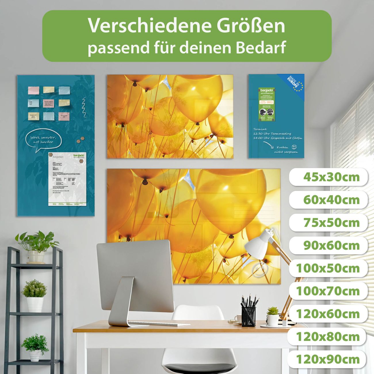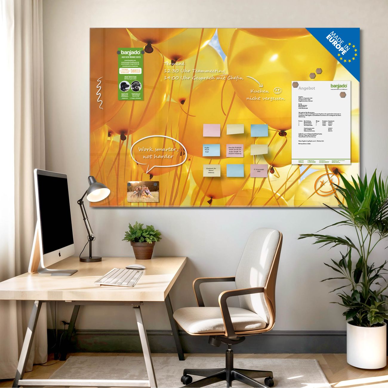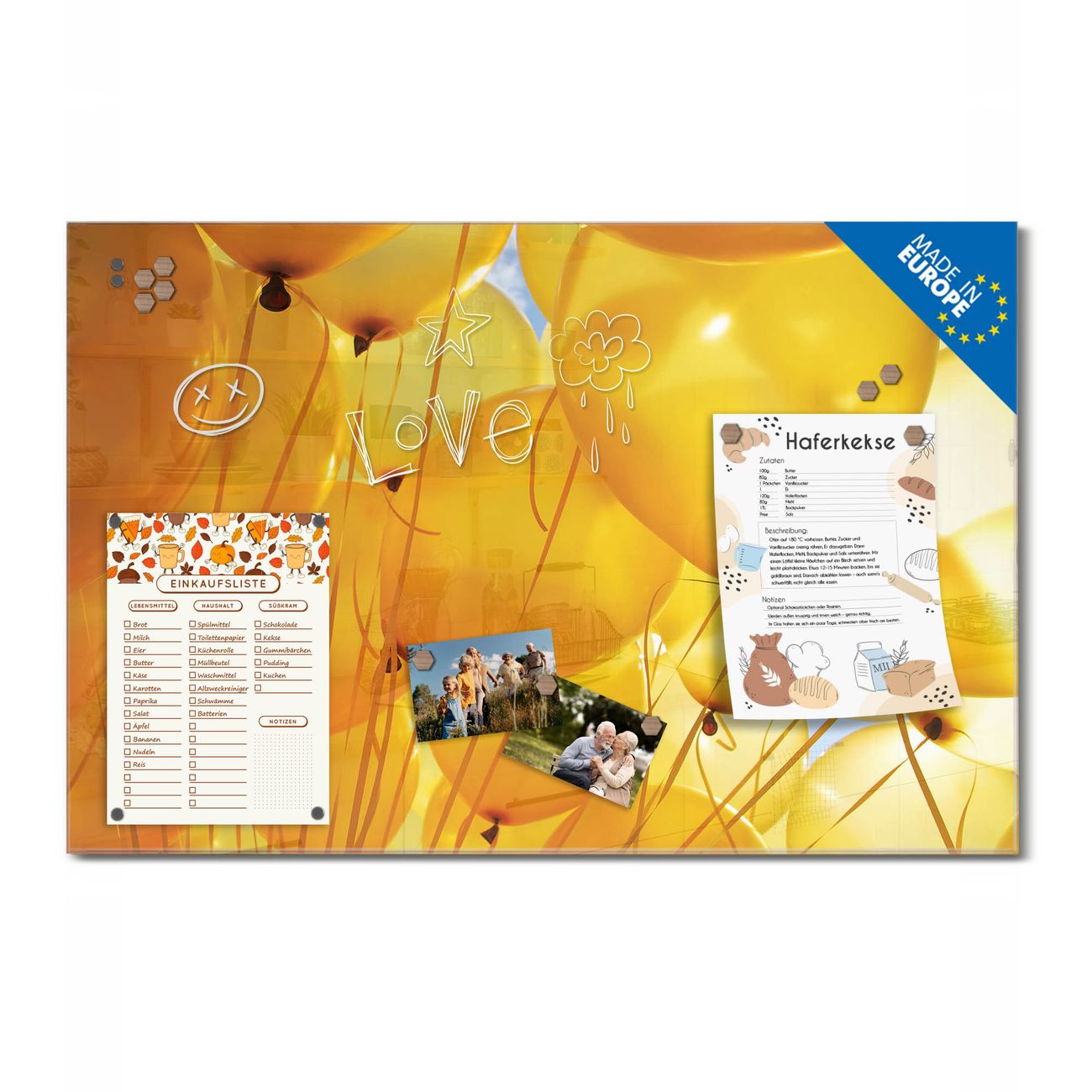Ein Stück Design, das Ihren Alltag organisiert. Schreiben, heften, inspirieren - alles an einem Ort. Qualität, die man spürt. Montage leicht gemacht. Handwerk mit Herz - veredelt in Sachsen. Einzigartiges Design mit Motiv Motiv Gelbe Luftballons Beschreibbare Glasoberfläche, leicht zu reinigen Starke Magnetkraft durch Stahlrückwand Inklusive 4 Neodym-Magneten Flexible Montageoptionen Handveredelt in Sachsen - Qualität, die bleibt