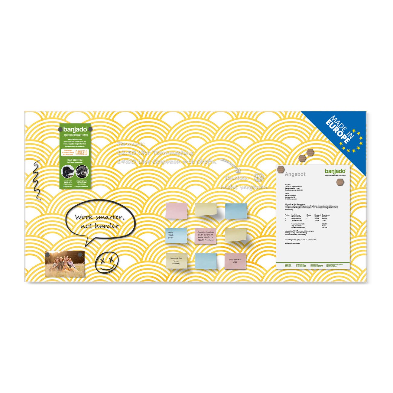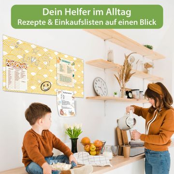 Ein Stück Design, das Ihren Alltag organisiert. Schreiben, heften, inspirieren - alles an einem Ort. Qualität, die man spürt. Montage leicht gemacht. Handwerk mit Herz - veredelt in Sachsen. Einzigartiges Design mit Motiv Motiv Gelbe Wellen Beschreibbare Glasoberfläche, leicht zu reinigen Starke Magnetkraft durch Stahlrückwand Inklusive 4 Neodym-Magneten Flexible Montageoptionen Handveredelt in Sachsen - Qualität, die bleibt