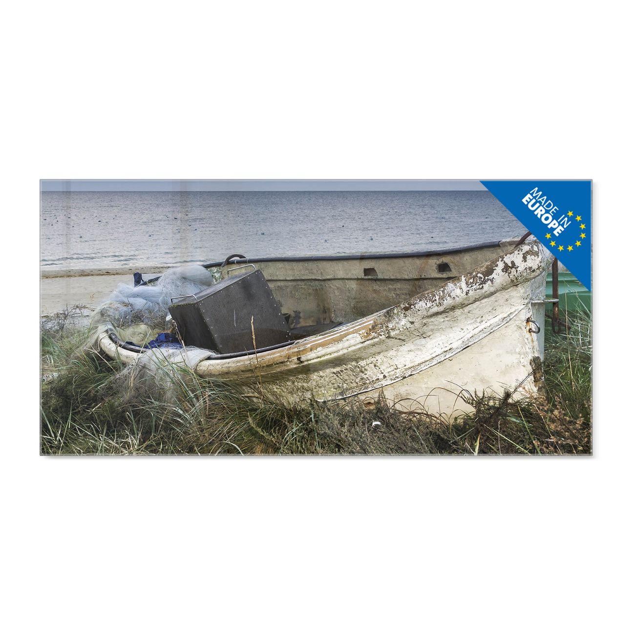 Glas Magnettafel im Querformat Motiv Vergessenes Fischerboot