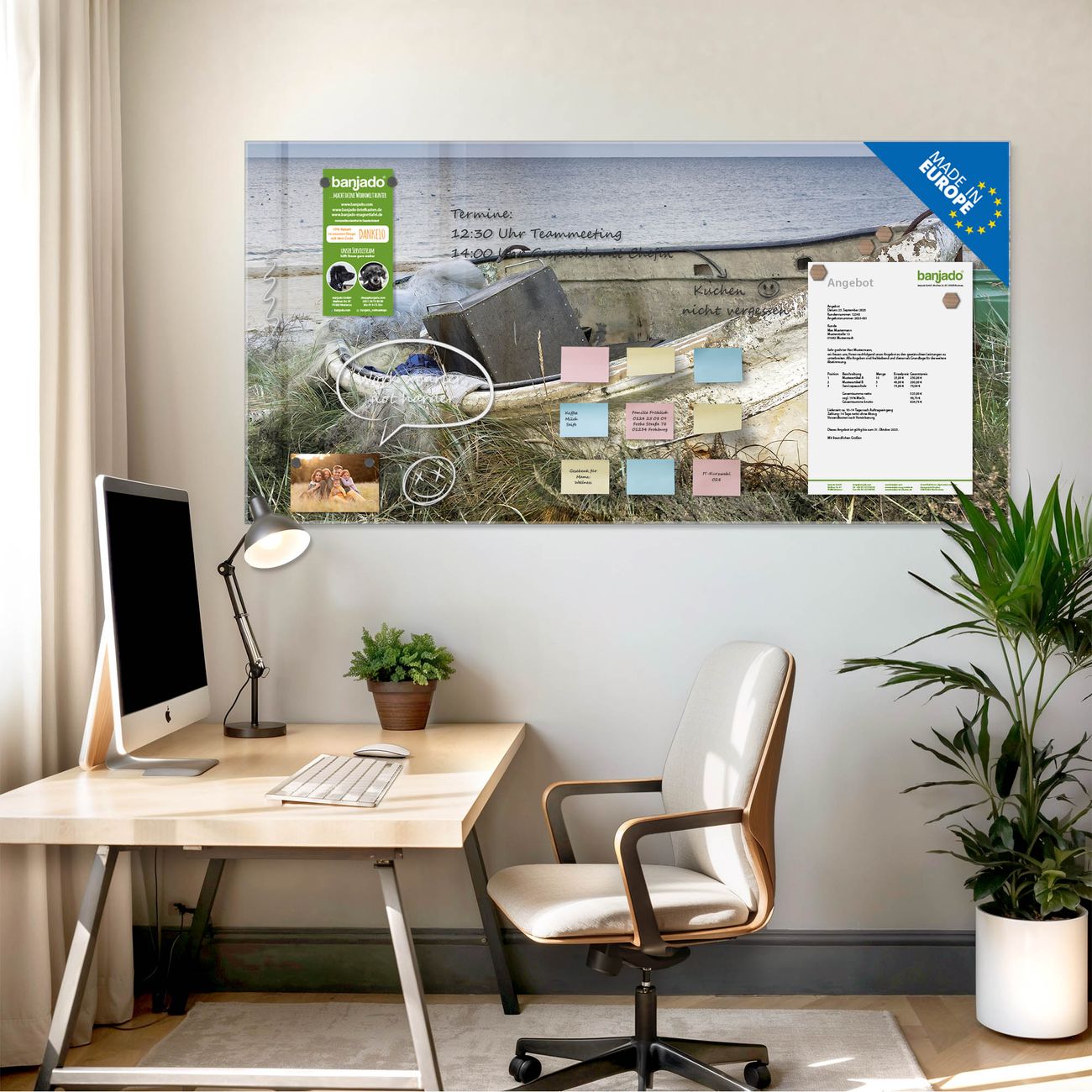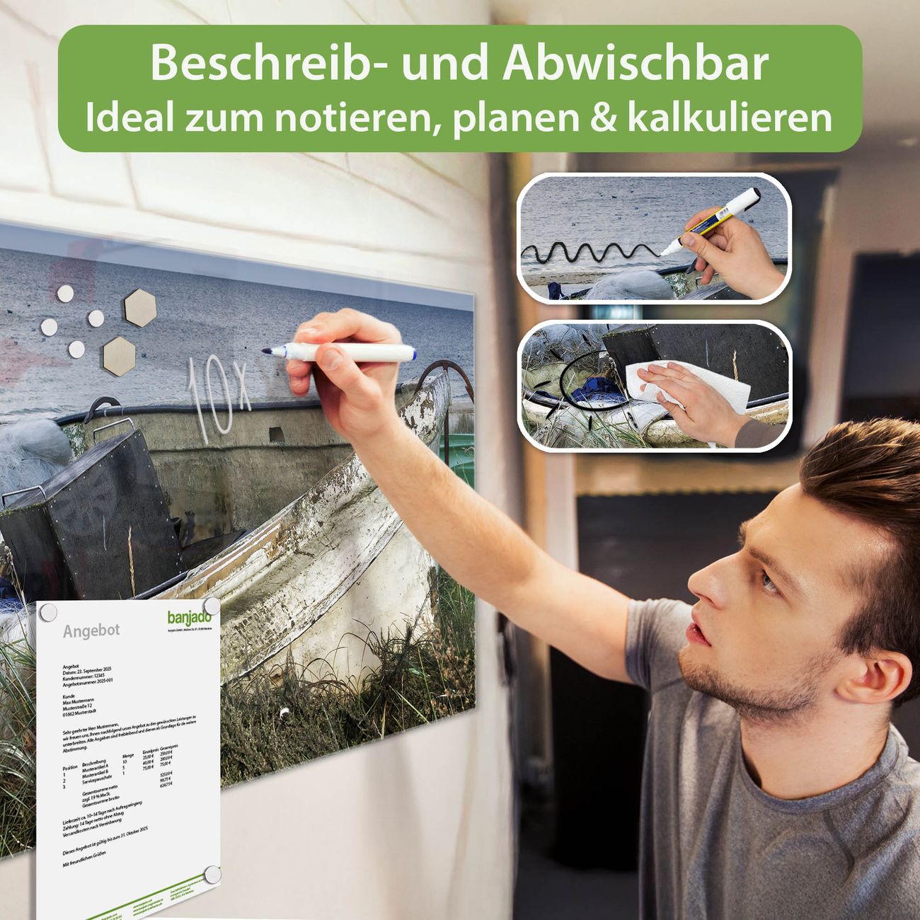 Jede Glas Magnettafel wird in unserer Werkstatt von Hand gefertigt und sorgfältig geprüft. So erhalten Sie ein echtes Qualitätsprodukt, das Funktion und Ästhetik perfekt vereint.?? Warum banjado?