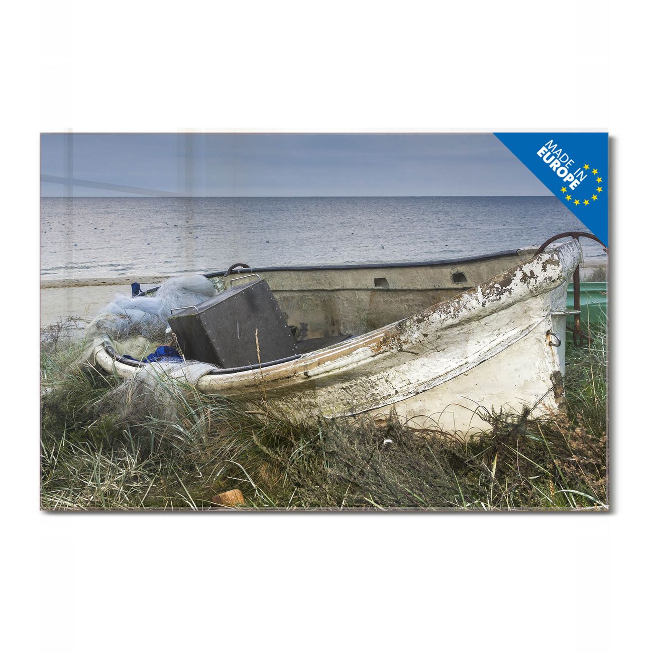 Glas Magnettafel im Querformat Motiv Vergessenes Fischerboot