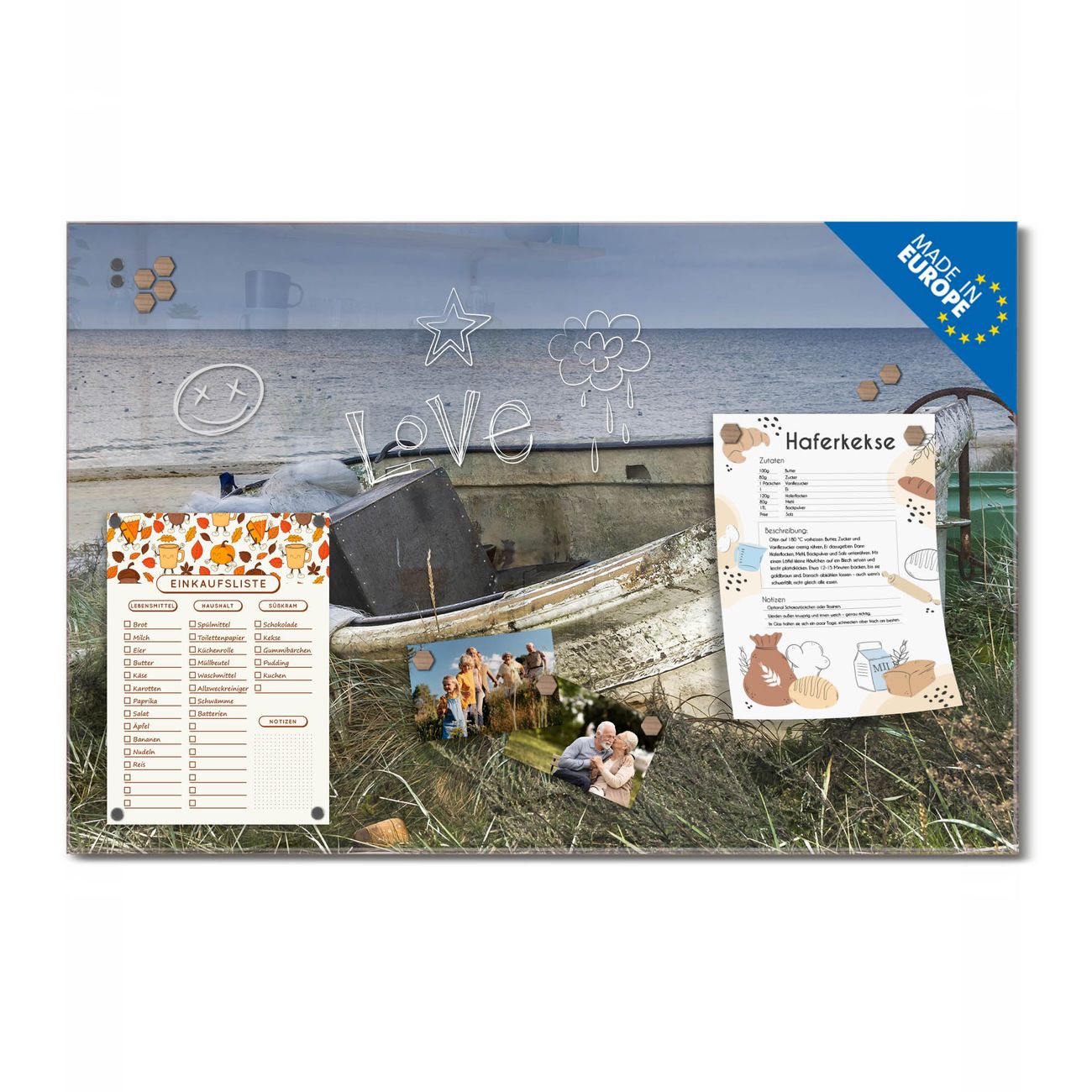 Ein Stück Design, das Ihren Alltag organisiert. Schreiben, heften, inspirieren - alles an einem Ort. Qualität, die man spürt. Montage leicht gemacht. Handwerk mit Herz - veredelt in Sachsen. Einzigartiges Design mit Motiv Motiv Vergessenes Fischerboot Beschreibbare Glasoberfläche, leicht zu reinigen Starke Magnetkraft durch Stahlrückwand Inklusive 4 Neodym-Magneten Flexible Montageoptionen Handveredelt in Sachsen - Qualität, die bleibt