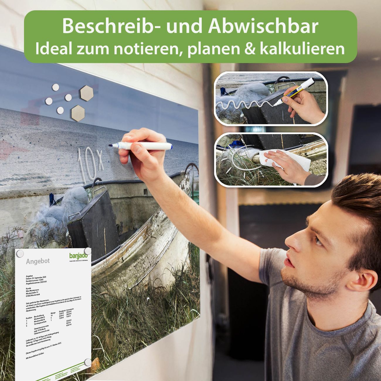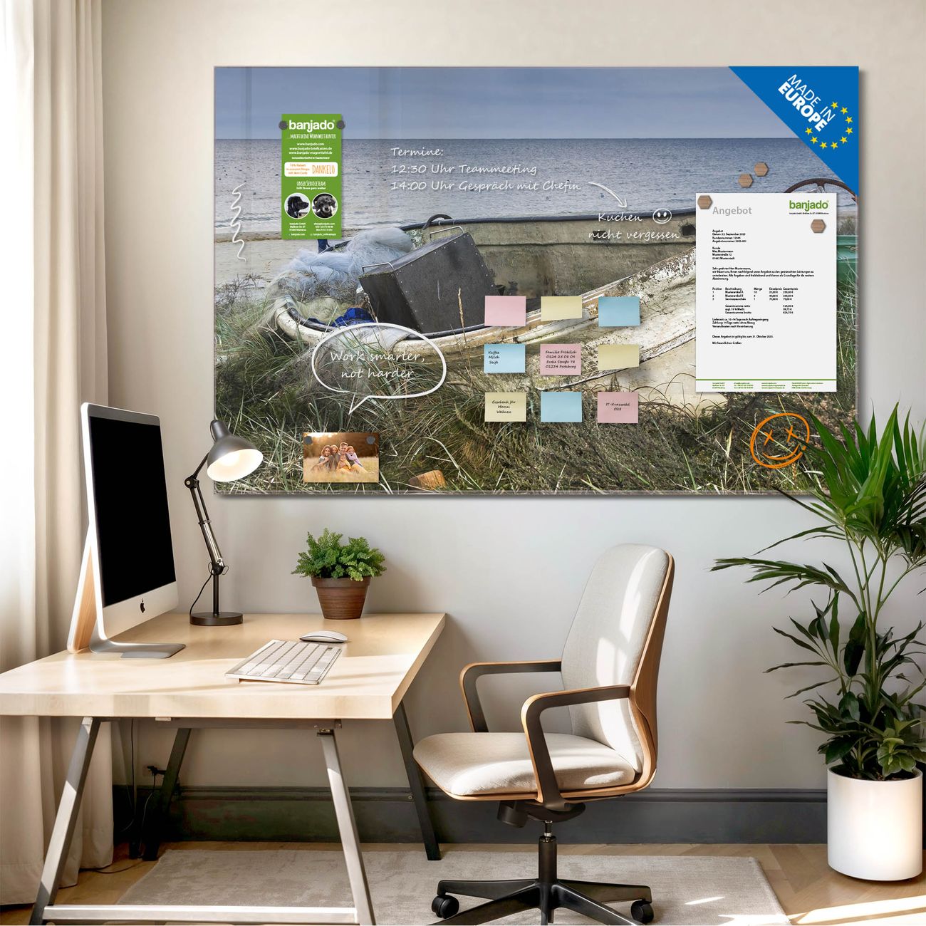 Jede Glas Magnettafel wird in unserer Werkstatt von Hand gefertigt und sorgfältig geprüft. So erhalten Sie ein echtes Qualitätsprodukt, das Funktion und Ästhetik perfekt vereint.?? Warum banjado?