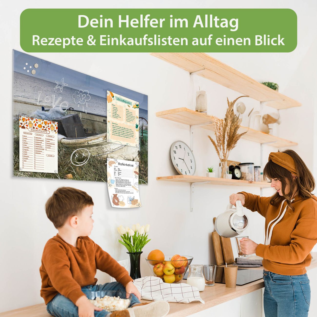 Auf der glatten Glasoberfläche lassen sich Termine, Rezepte oder Notizen ganz einfach mit Kreidestiften festhalten und rückstandslos entfernen. Starke Neodym-Magnete halten Ihre wichtigsten Erinnerungen sicher an Ort und Stelle. So entsteht Ihre ganz persönliche Ideenwand - jeden Tag neu.