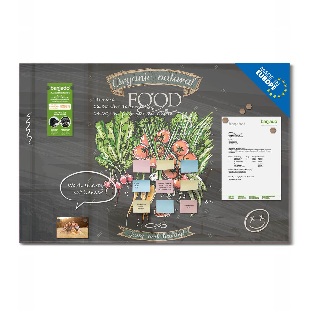 Ein Stück Design, das Ihren Alltag organisiert. Schreiben, heften, inspirieren - alles an einem Ort. Qualität, die man spürt. Montage leicht gemacht. Handwerk mit Herz - veredelt in Sachsen. Einzigartiges Design mit Motiv Motiv Gesund Und Lecker Beschreibbare Glasoberfläche, leicht zu reinigen Starke Magnetkraft durch Stahlrückwand Inklusive 4 Neodym-Magneten Flexible Montageoptionen Handveredelt in Sachsen - Qualität, die bleibt