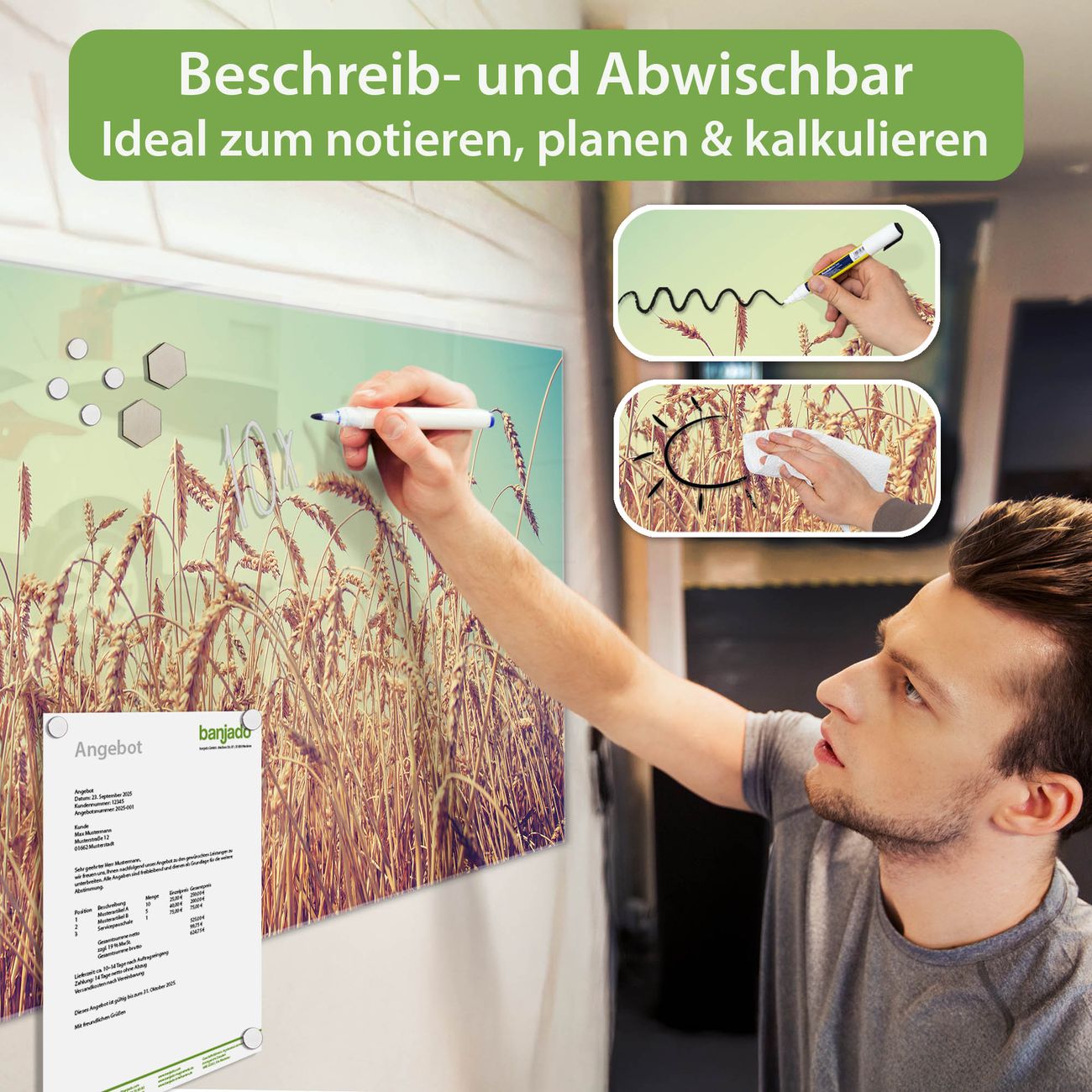 Jede Glas Magnettafel wird in unserer Werkstatt von Hand gefertigt und sorgfältig geprüft. So erhalten Sie ein echtes Qualitätsprodukt, das Funktion und Ästhetik perfekt vereint.?? Warum banjado?