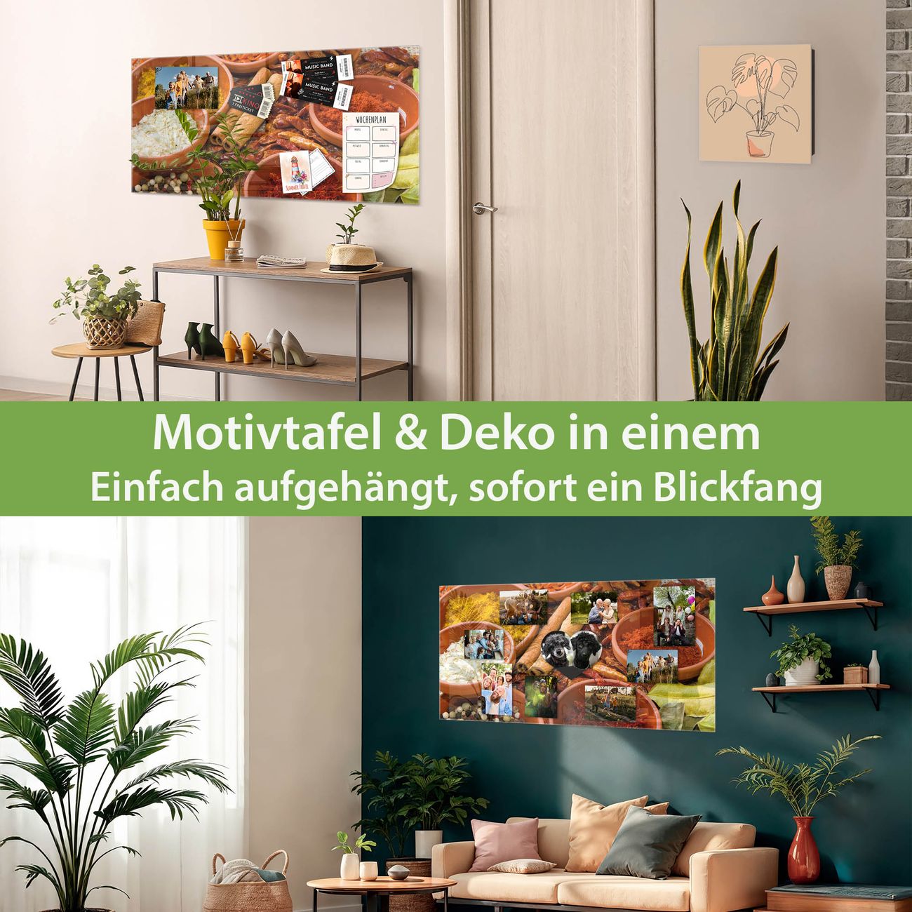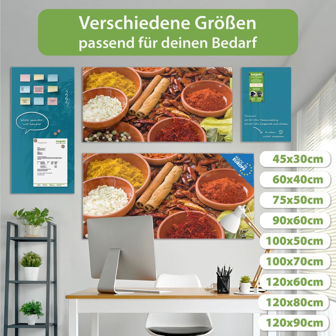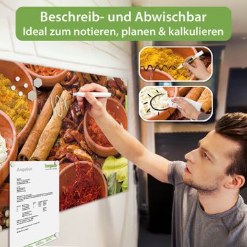 Die banjado Glas Magnettafel mit dem Motiv Motiv Gewürze verbindet Funktionalität mit Stil. Sie ersetzt das Zettelchaos durch klare Strukturen und bringt dabei eine warme, natürliche Atmosphäre in Ihr Zuhause. Ob im Büro, in der Küche oder im Eingangsbereich - dieses Design-Board zieht Blicke an und sorgt für Ordnung mit Charakter.