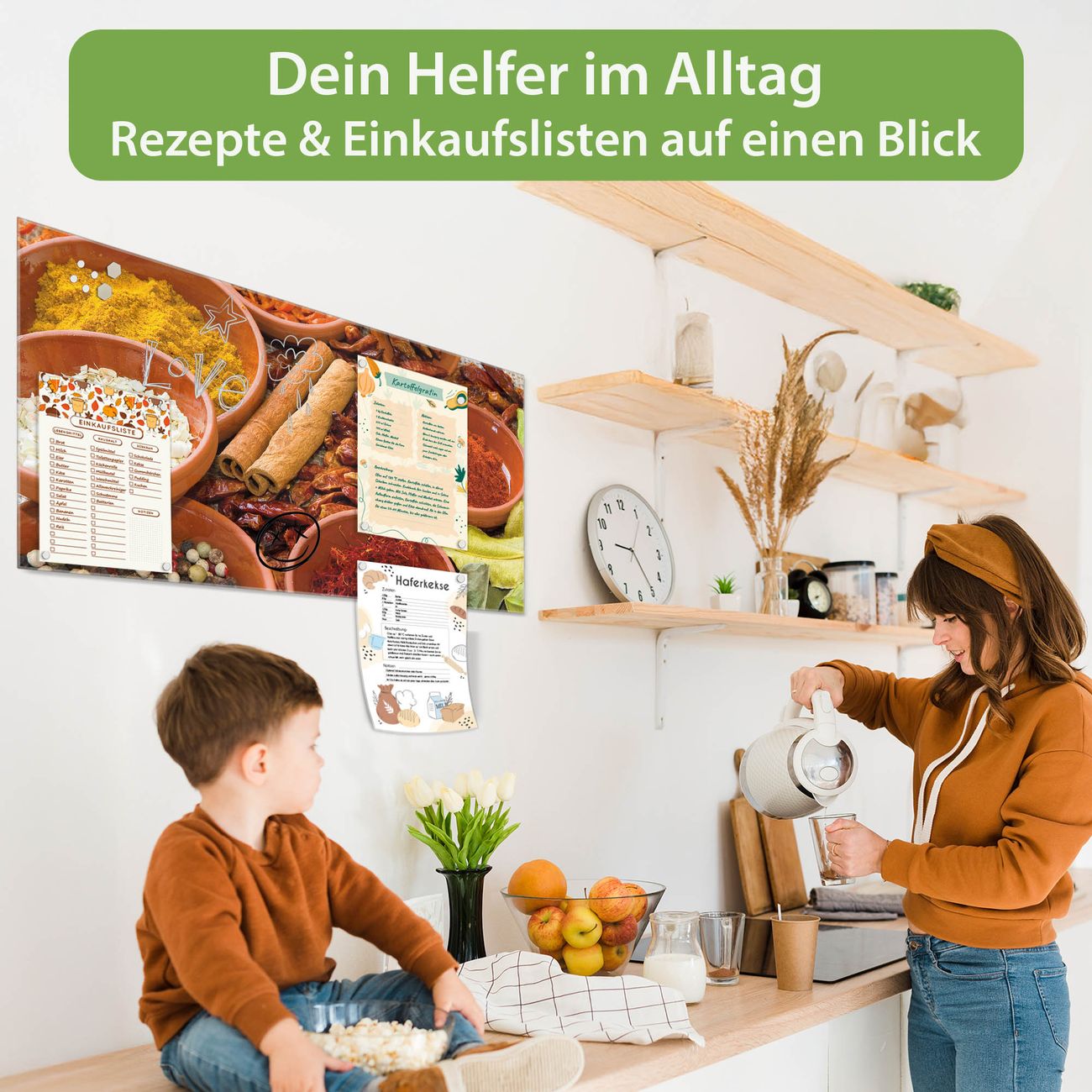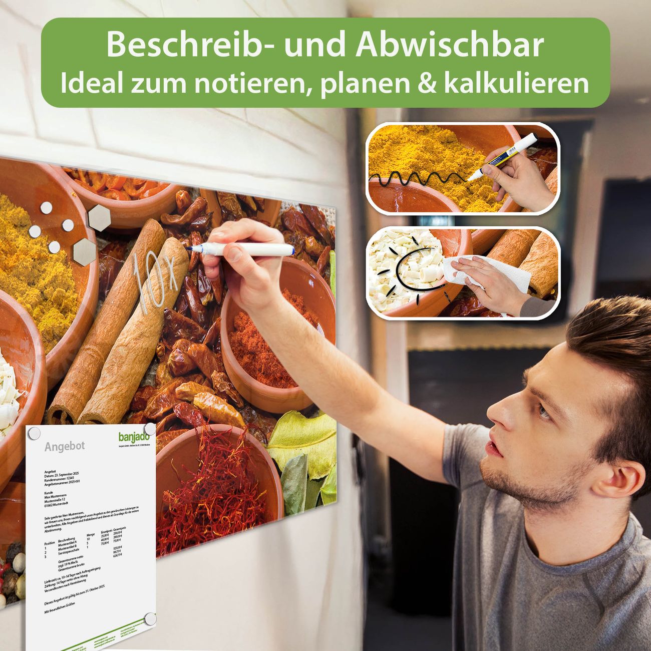 Ein Stück Design, das Ihren Alltag organisiert. Schreiben, heften, inspirieren - alles an einem Ort. Qualität, die man spürt. Montage leicht gemacht. Handwerk mit Herz - veredelt in Sachsen. Einzigartiges Design mit Motiv Motiv Gewürze Beschreibbare Glasoberfläche, leicht zu reinigen Starke Magnetkraft durch Stahlrückwand Inklusive 4 Neodym-Magneten Flexible Montageoptionen Handveredelt in Sachsen - Qualität, die bleibt