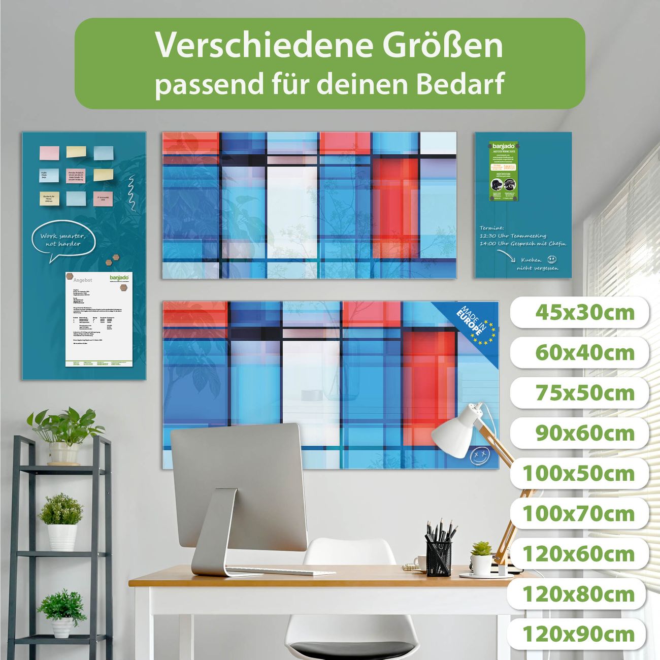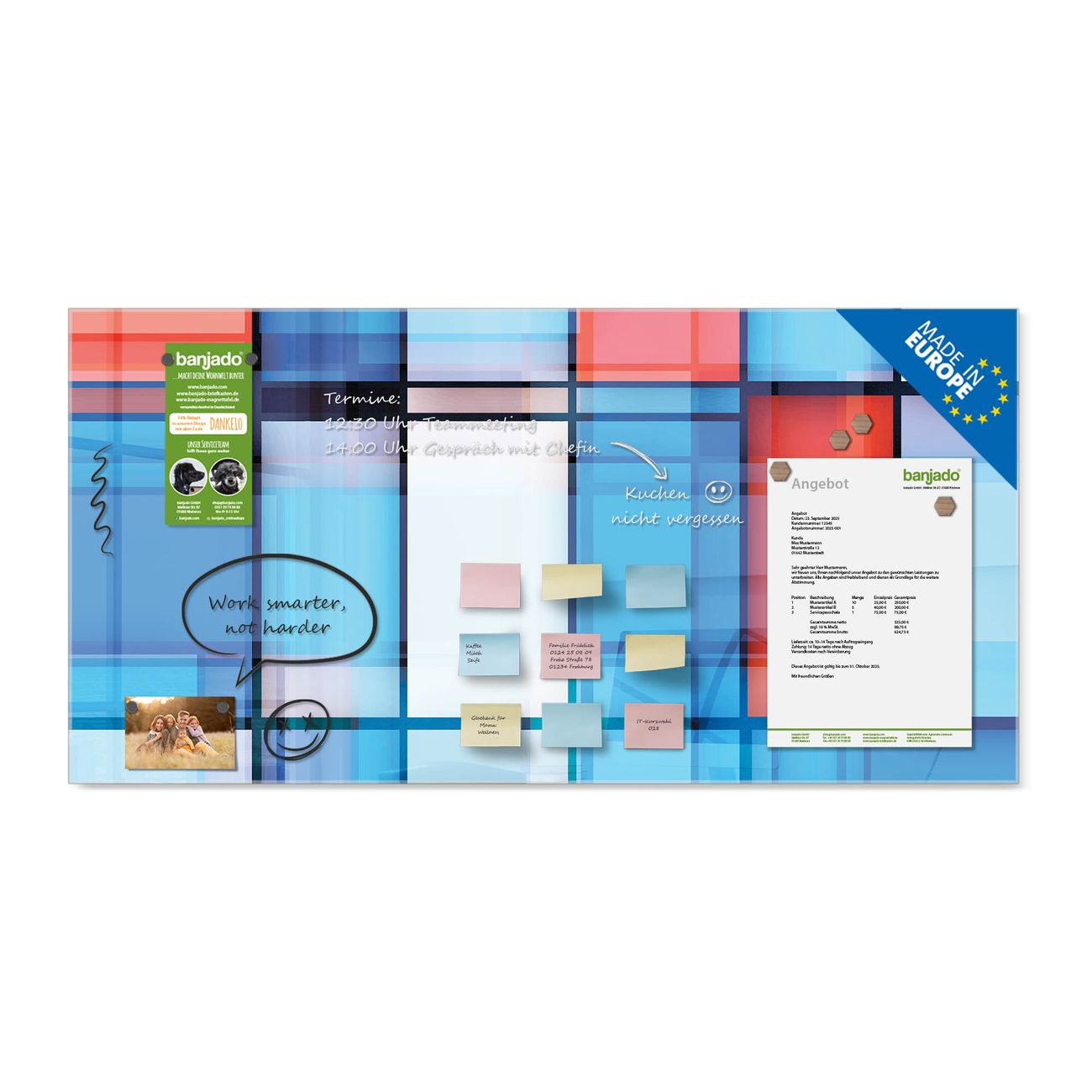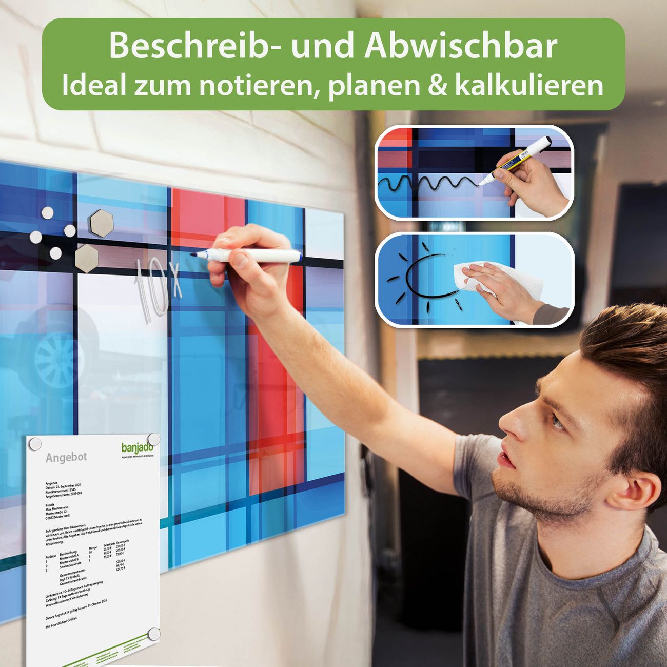 Jede Glas Magnettafel wird in unserer Werkstatt von Hand gefertigt und sorgfältig geprüft. So erhalten Sie ein echtes Qualitätsprodukt, das Funktion und Ästhetik perfekt vereint.?? Warum banjado?