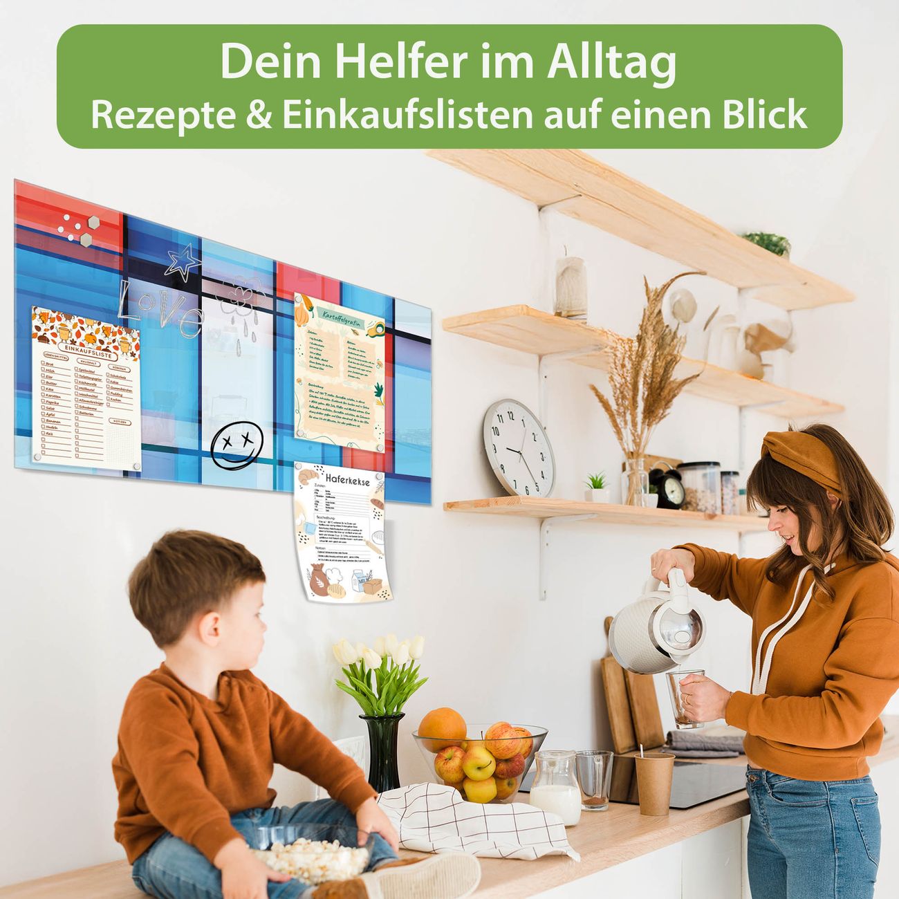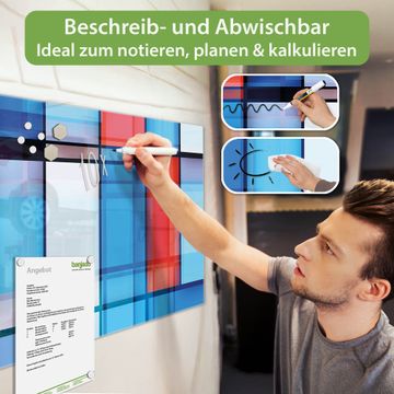 Auf der glatten Glasoberfläche lassen sich Termine, Rezepte oder Notizen ganz einfach mit Kreidestiften festhalten und rückstandslos entfernen. Starke Neodym-Magnete halten Ihre wichtigsten Erinnerungen sicher an Ort und Stelle. So entsteht Ihre ganz persönliche Ideenwand - jeden Tag neu.
