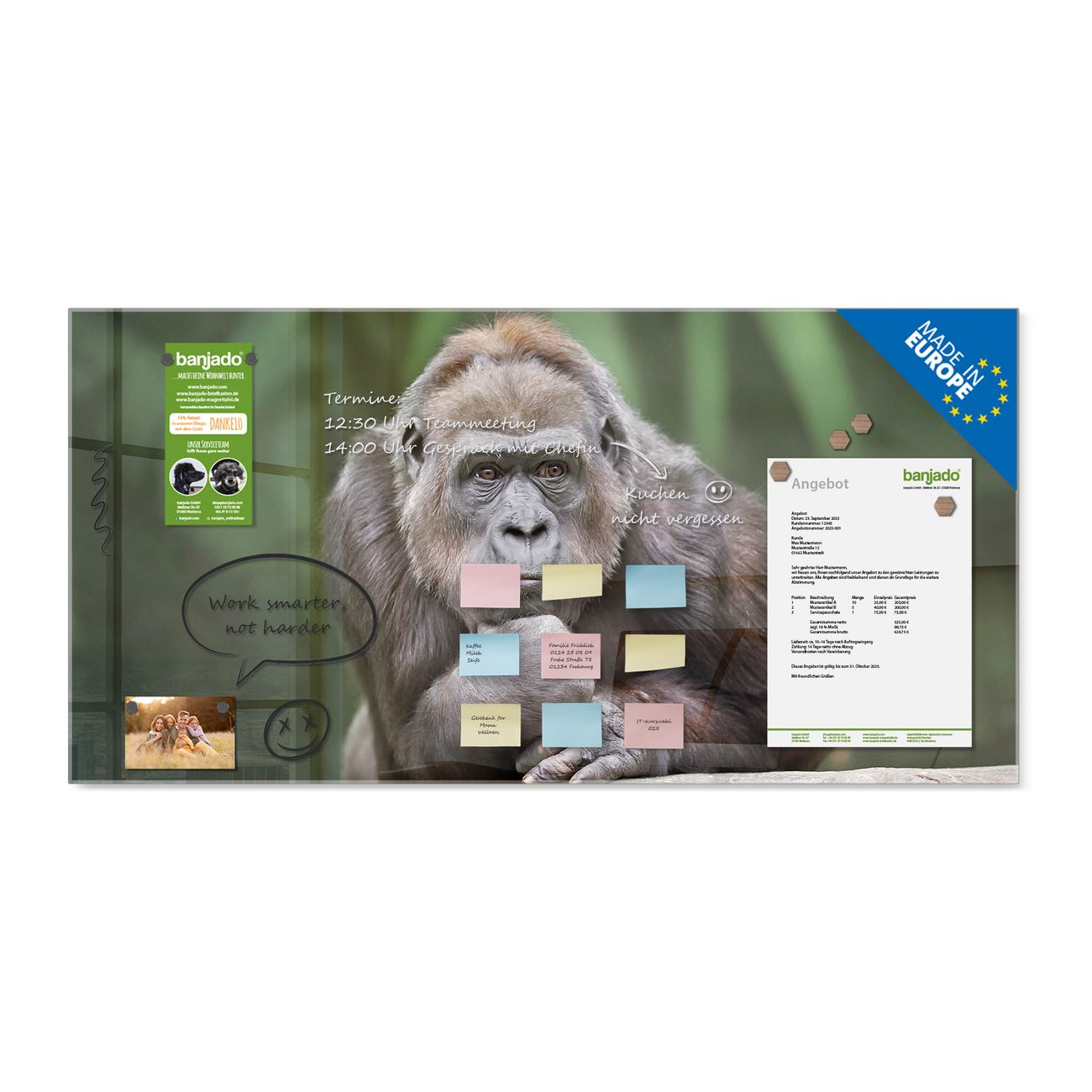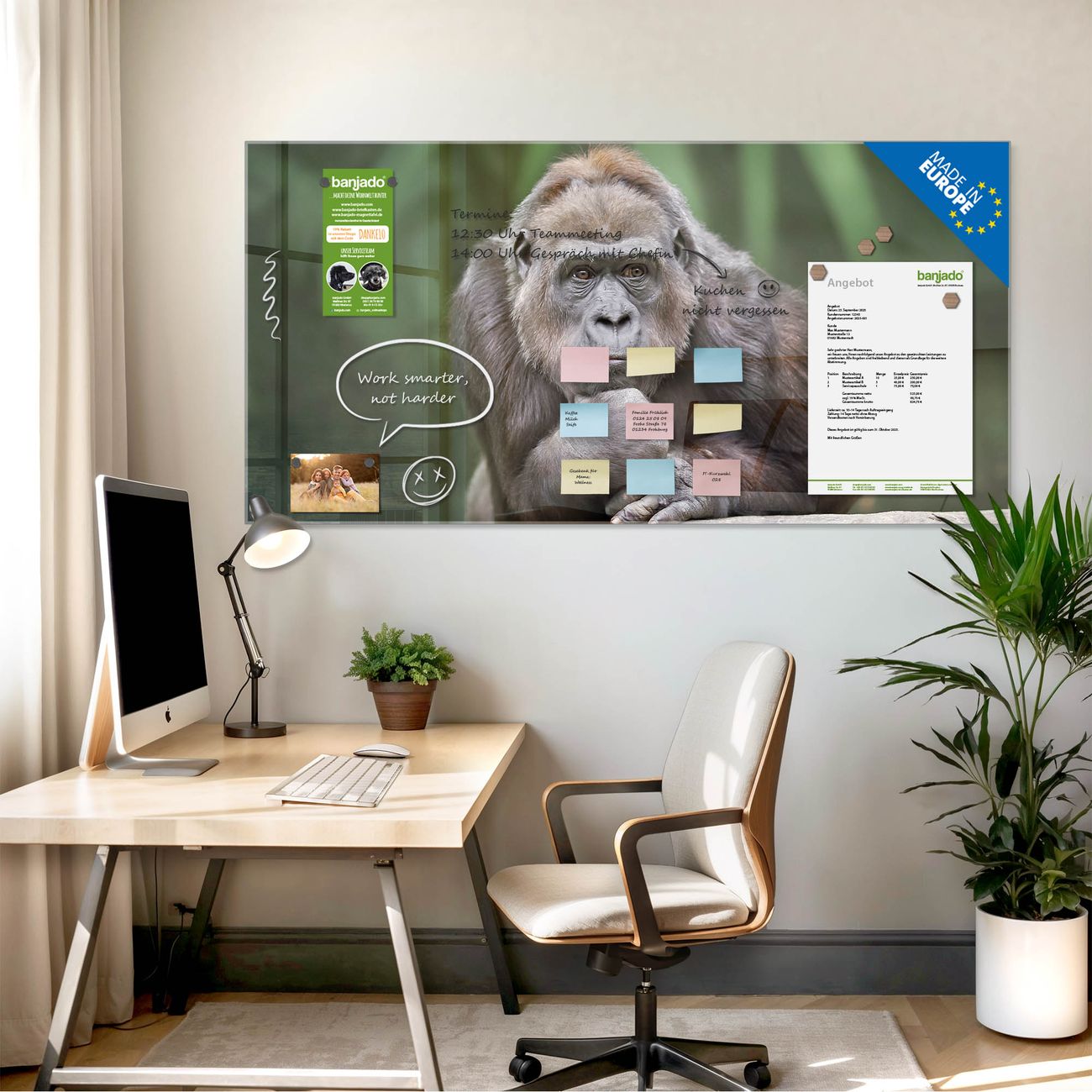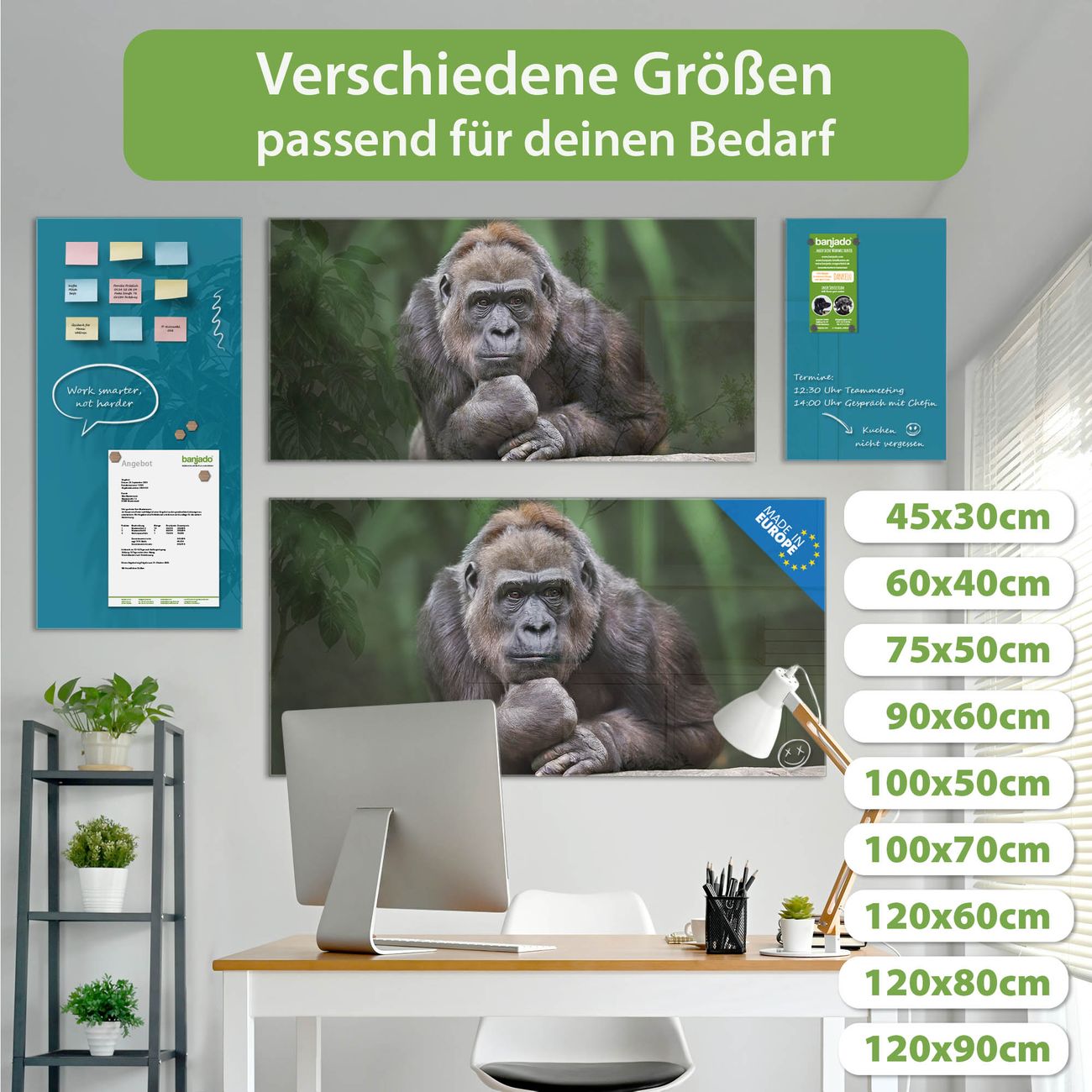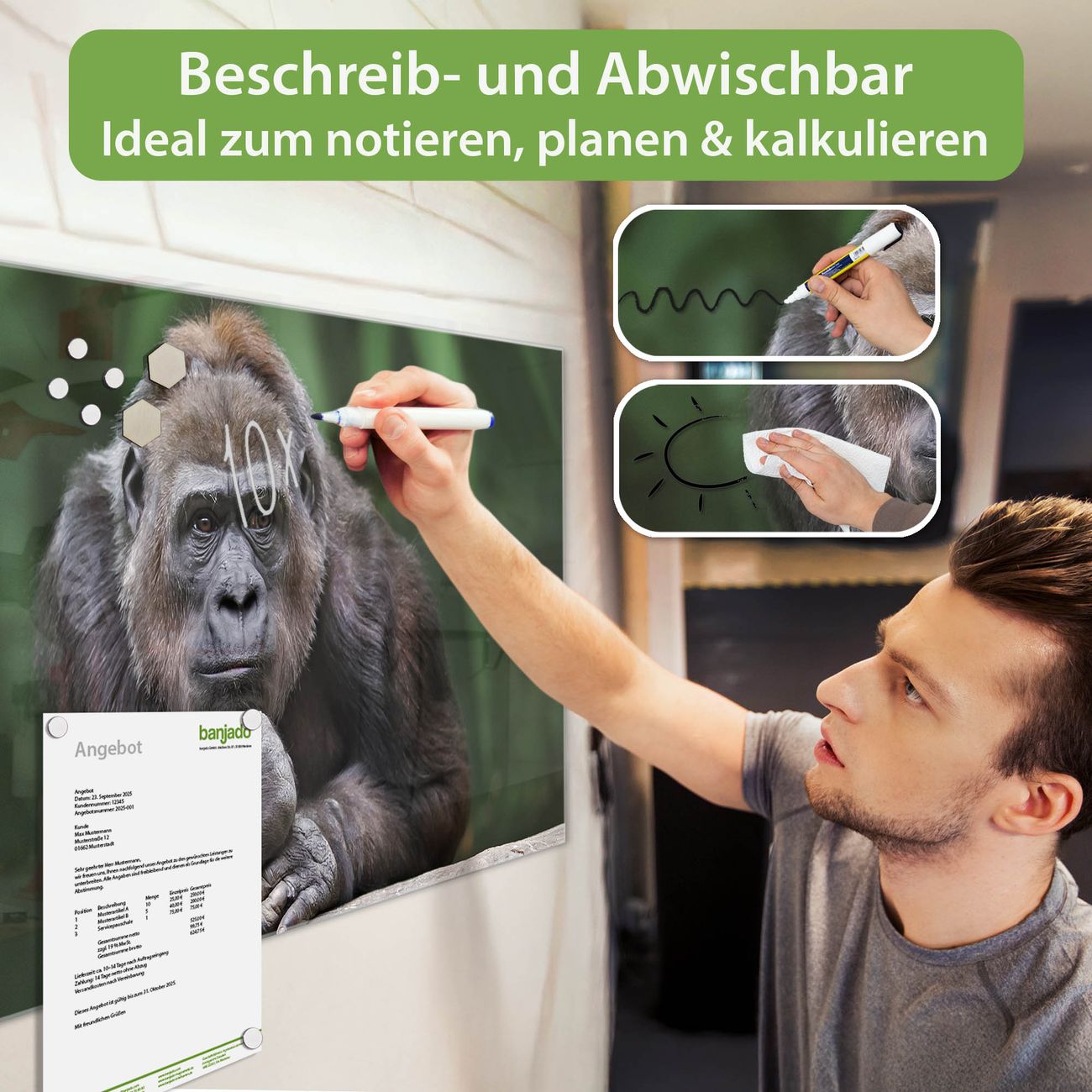 Die banjado Glas Magnettafel mit dem Motiv Motiv Gorilla verbindet Funktionalität mit Stil. Sie ersetzt das Zettelchaos durch klare Strukturen und bringt dabei eine warme, natürliche Atmosphäre in Ihr Zuhause. Ob im Büro, in der Küche oder im Eingangsbereich - dieses Design-Board zieht Blicke an und sorgt für Ordnung mit Charakter.