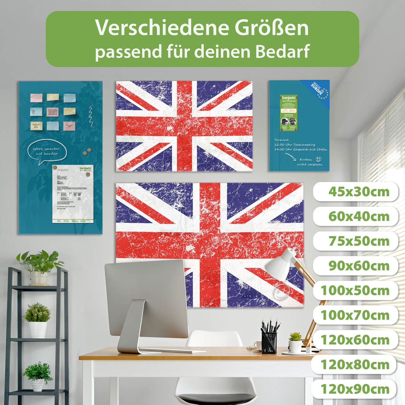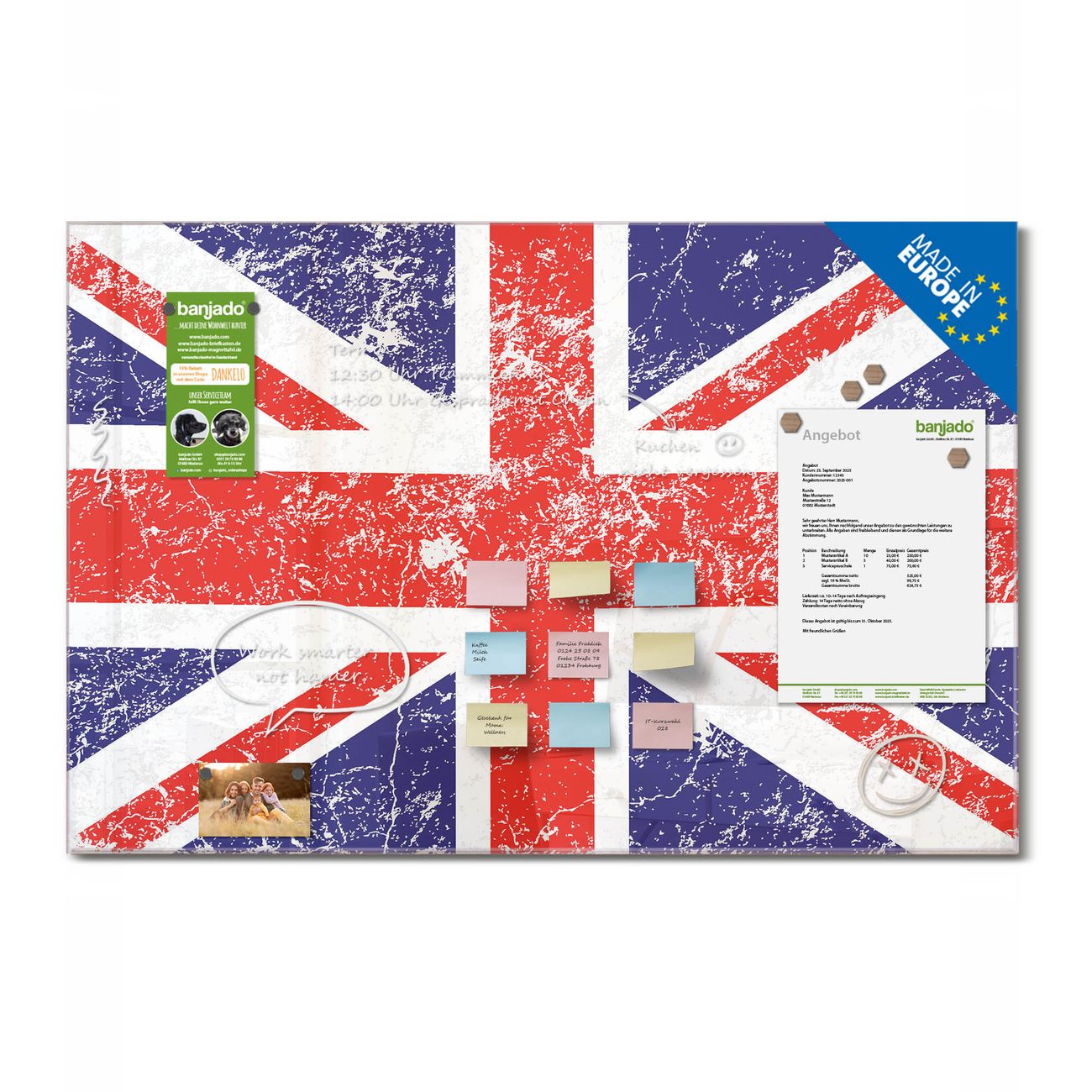 Ein Stück Design, das Ihren Alltag organisiert. Schreiben, heften, inspirieren - alles an einem Ort. Qualität, die man spürt. Montage leicht gemacht. Handwerk mit Herz - veredelt in Sachsen. Einzigartiges Design mit Motiv Motiv Great Britain Beschreibbare Glasoberfläche, leicht zu reinigen Starke Magnetkraft durch Stahlrückwand Inklusive 4 Neodym-Magneten Flexible Montageoptionen Handveredelt in Sachsen - Qualität, die bleibt