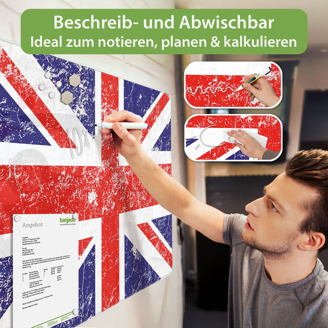 Jede Glas Magnettafel wird in unserer Werkstatt von Hand gefertigt und sorgfältig geprüft. So erhalten Sie ein echtes Qualitätsprodukt, das Funktion und Ästhetik perfekt vereint.?? Warum banjado?