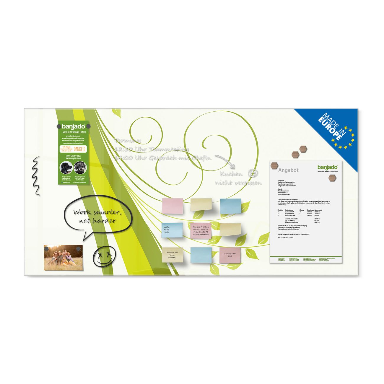 Jede Glas Magnettafel wird in unserer Werkstatt von Hand gefertigt und sorgfältig geprüft. So erhalten Sie ein echtes Qualitätsprodukt, das Funktion und Ästhetik perfekt vereint.?? Warum banjado?