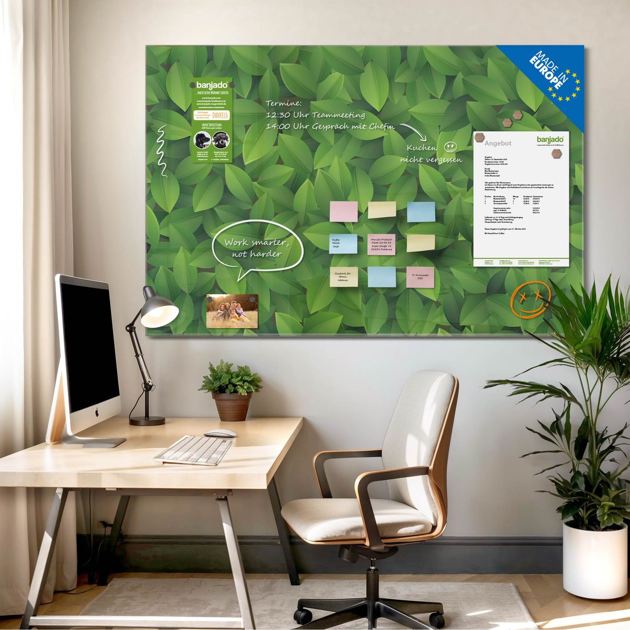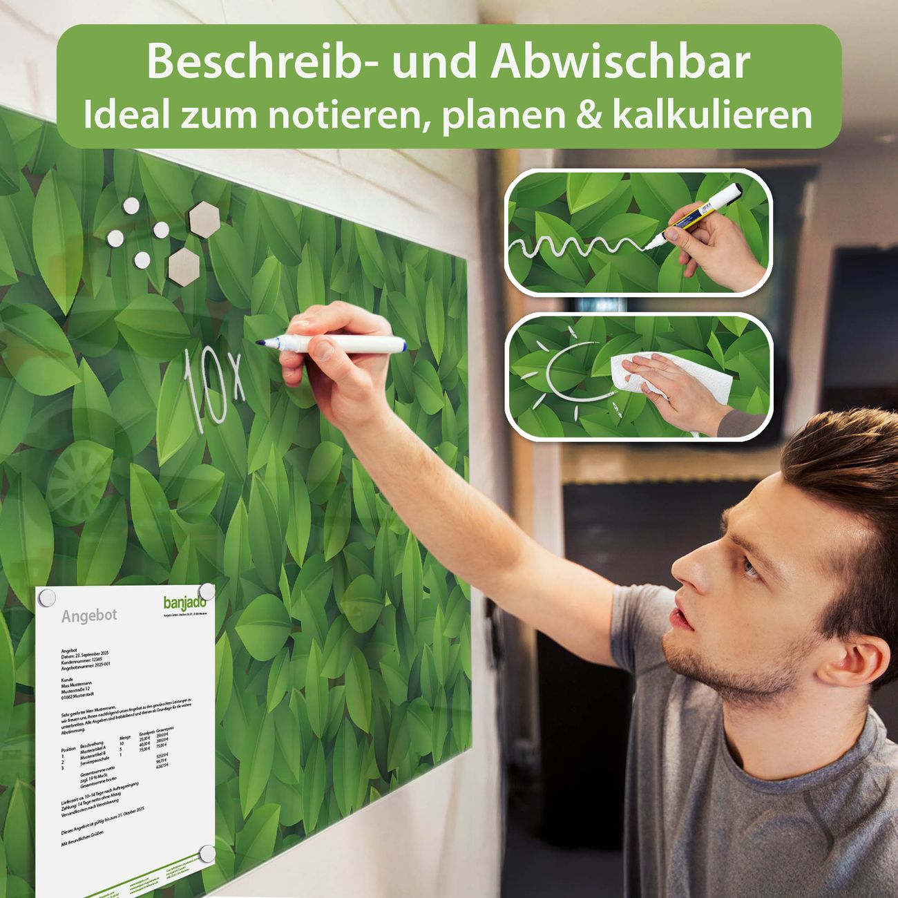 Die banjado Glas Magnettafel mit dem Motiv Motiv Grüne Blätter verbindet Funktionalität mit Stil. Sie ersetzt das Zettelchaos durch klare Strukturen und bringt dabei eine warme, natürliche Atmosphäre in Ihr Zuhause. Ob im Büro, in der Küche oder im Eingangsbereich - dieses Design-Board zieht Blicke an und sorgt für Ordnung mit Charakter.