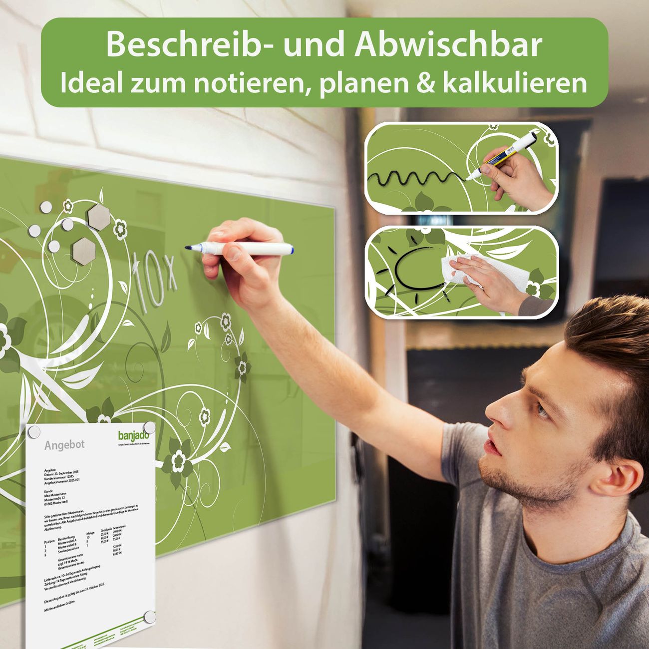 Ein Stück Design, das Ihren Alltag organisiert. Schreiben, heften, inspirieren - alles an einem Ort. Qualität, die man spürt. Montage leicht gemacht. Handwerk mit Herz - veredelt in Sachsen. Einzigartiges Design mit Motiv Motiv Grüne Blüten Beschreibbare Glasoberfläche, leicht zu reinigen Starke Magnetkraft durch Stahlrückwand Inklusive 4 Neodym-Magneten Flexible Montageoptionen Handveredelt in Sachsen - Qualität, die bleibt