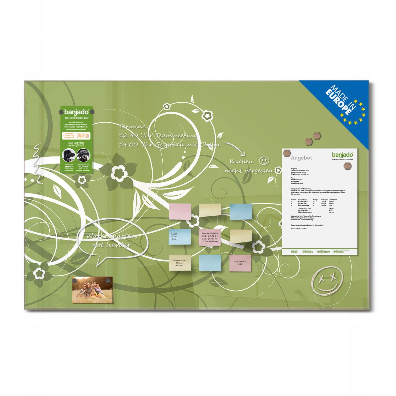 Jede Glas Magnettafel wird in unserer Werkstatt von Hand gefertigt und sorgfältig geprüft. So erhalten Sie ein echtes Qualitätsprodukt, das Funktion und Ästhetik perfekt vereint.?? Warum banjado?