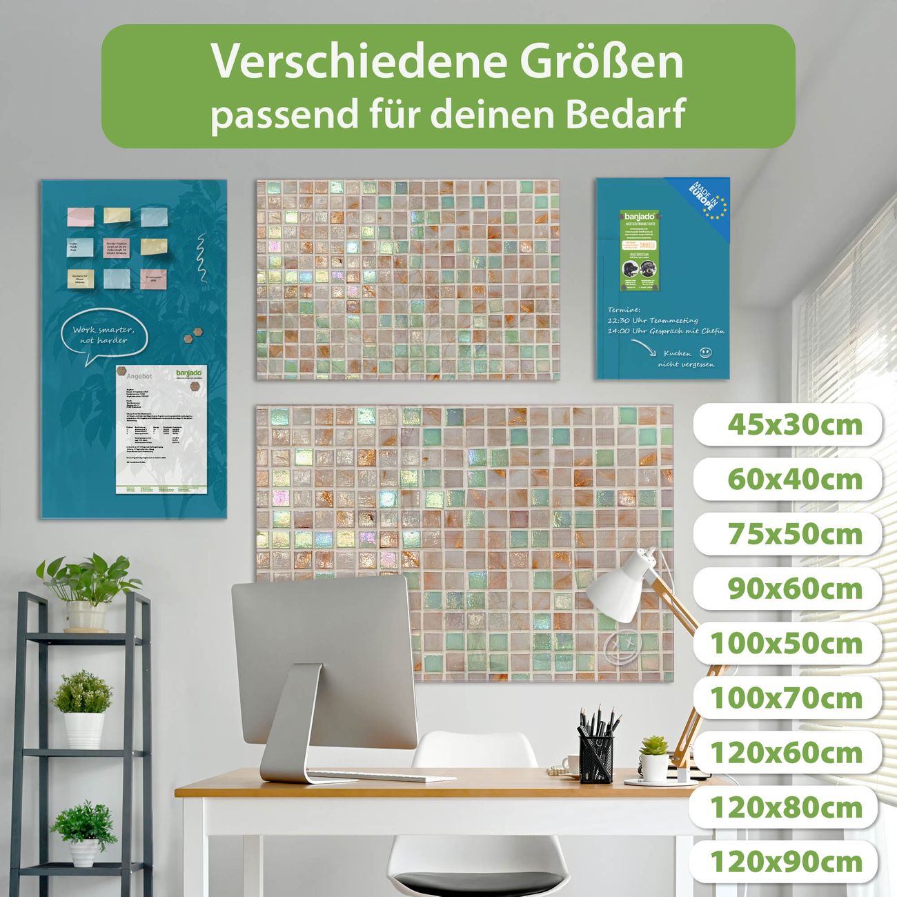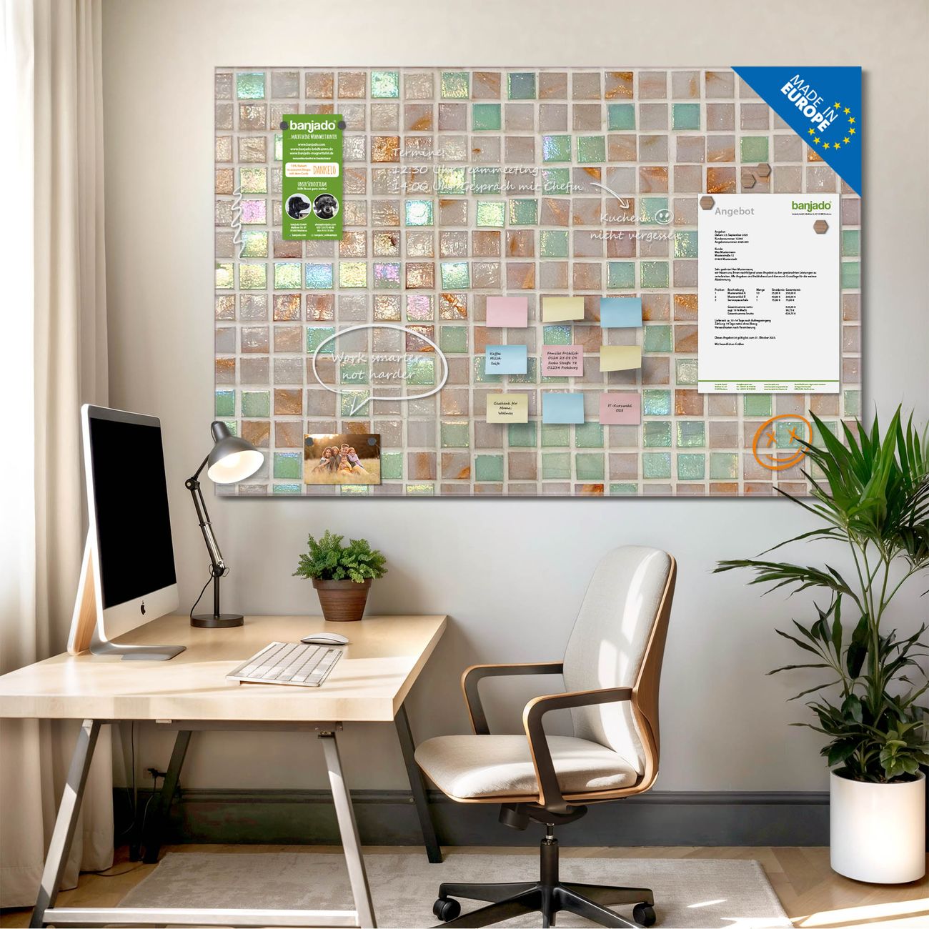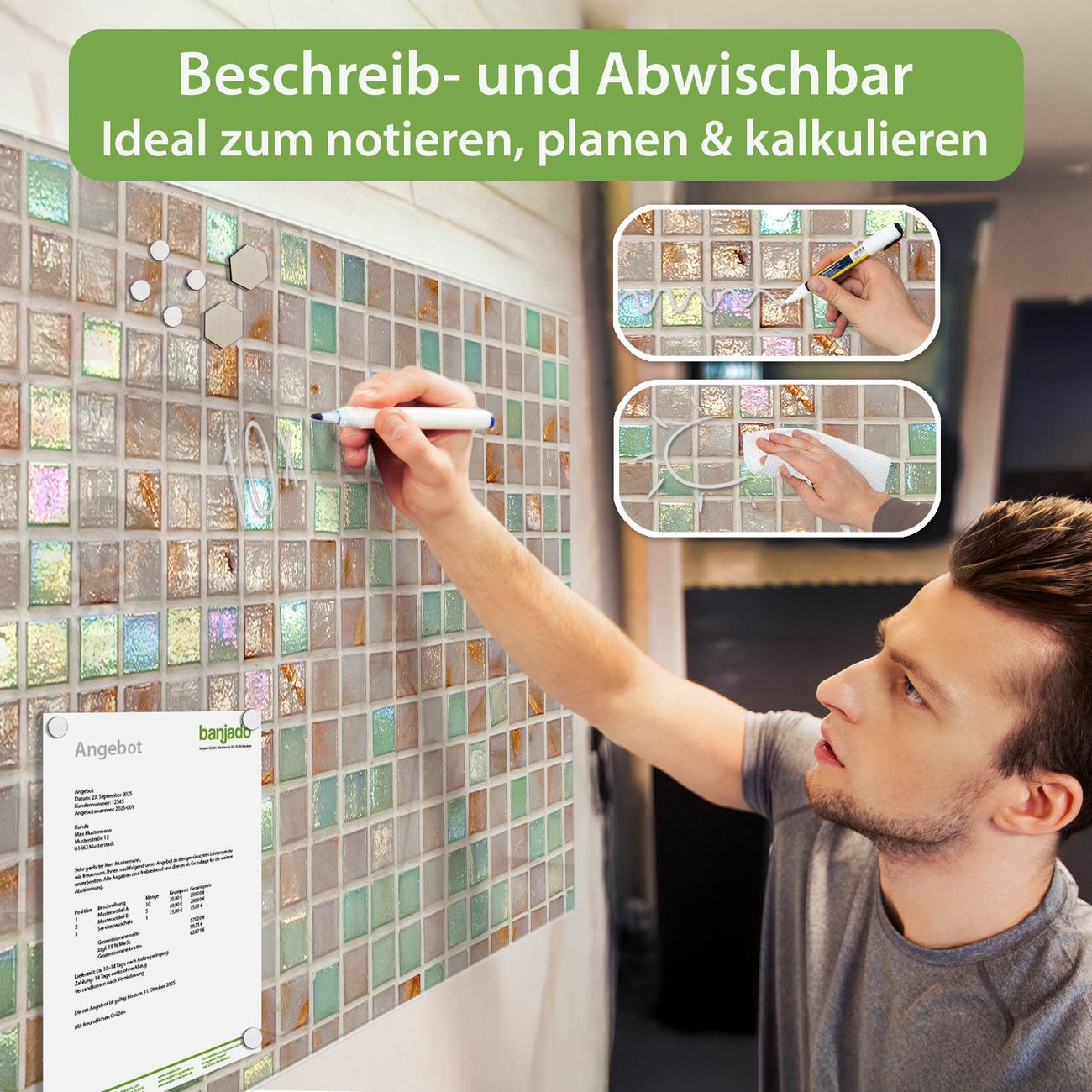Jede Glas Magnettafel wird in unserer Werkstatt von Hand gefertigt und sorgfältig geprüft. So erhalten Sie ein echtes Qualitätsprodukt, das Funktion und Ästhetik perfekt vereint.?? Warum banjado?