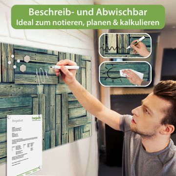 Ein Stück Design, das Ihren Alltag organisiert. Schreiben, heften, inspirieren - alles an einem Ort. Qualität, die man spürt. Montage leicht gemacht. Handwerk mit Herz - veredelt in Sachsen. Einzigartiges Design mit Motiv Motiv Grüne Planken Beschreibbare Glasoberfläche, leicht zu reinigen Starke Magnetkraft durch Stahlrückwand Inklusive 4 Neodym-Magneten Flexible Montageoptionen Handveredelt in Sachsen - Qualität, die bleibt
