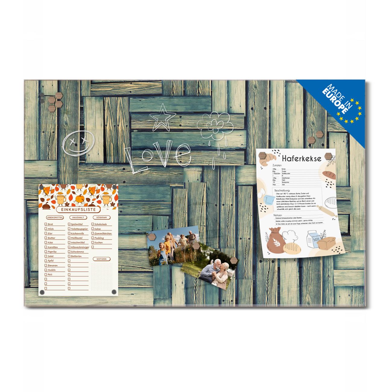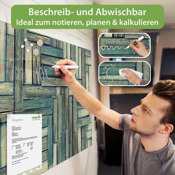 Ein Stück Design, das Ihren Alltag organisiert. Schreiben, heften, inspirieren - alles an einem Ort. Qualität, die man spürt. Montage leicht gemacht. Handwerk mit Herz - veredelt in Sachsen. Einzigartiges Design mit Motiv Motiv Grüne Planken Beschreibbare Glasoberfläche, leicht zu reinigen Starke Magnetkraft durch Stahlrückwand Inklusive 4 Neodym-Magneten Flexible Montageoptionen Handveredelt in Sachsen - Qualität, die bleibt