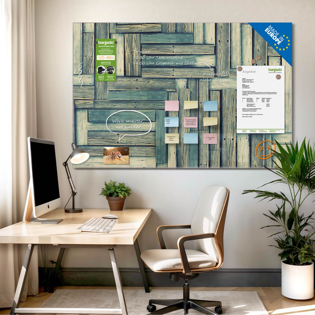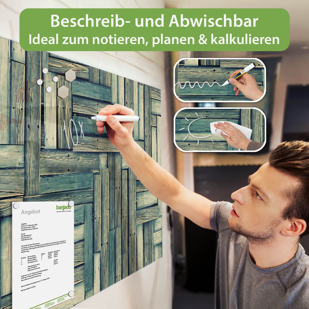 Jede Glas Magnettafel wird in unserer Werkstatt von Hand gefertigt und sorgfältig geprüft. So erhalten Sie ein echtes Qualitätsprodukt, das Funktion und Ästhetik perfekt vereint.?? Warum banjado?
