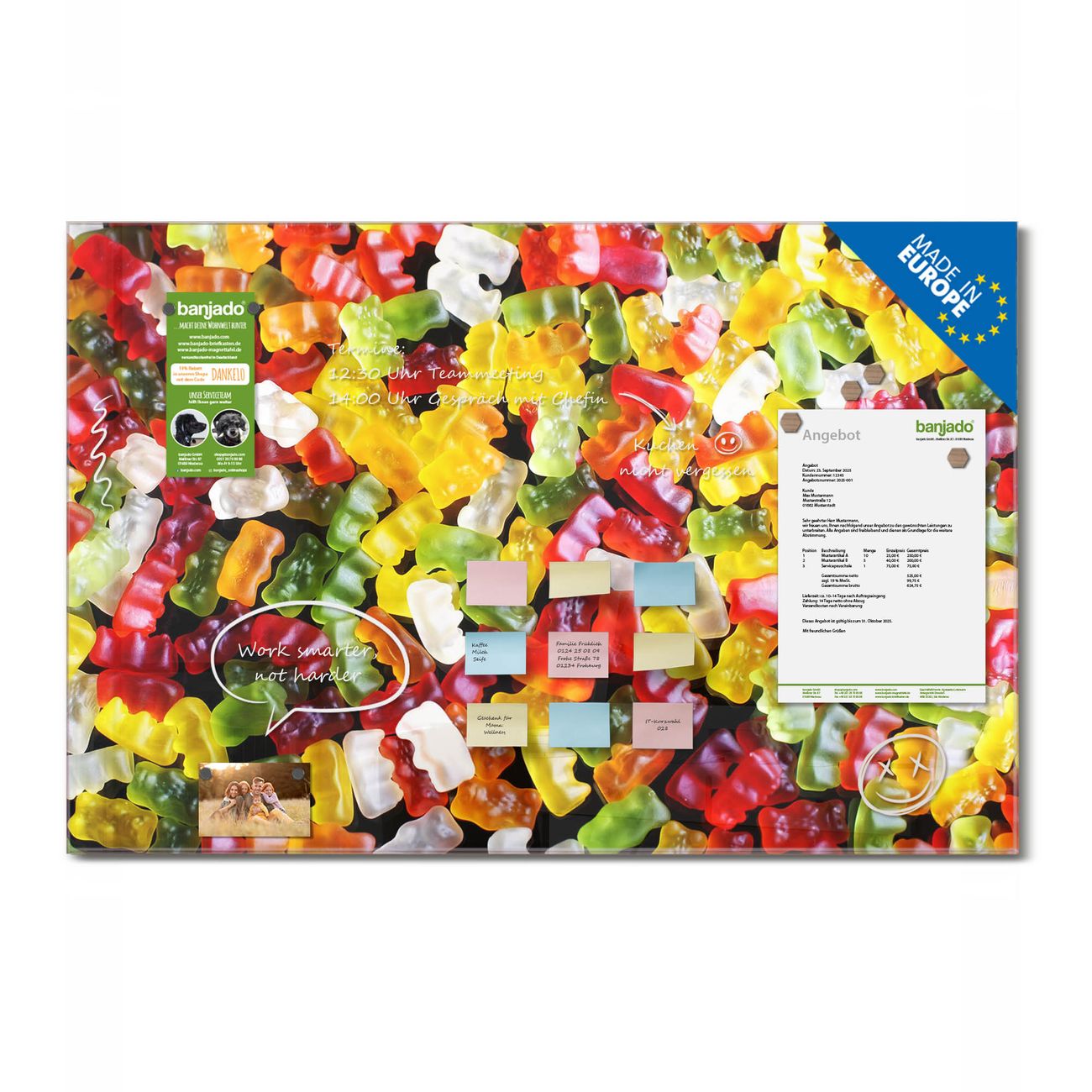 Ein Stück Design, das Ihren Alltag organisiert. Schreiben, heften, inspirieren - alles an einem Ort. Qualität, die man spürt. Montage leicht gemacht. Handwerk mit Herz - veredelt in Sachsen. Einzigartiges Design mit Motiv Motiv Gummibaerchen Beschreibbare Glasoberfläche, leicht zu reinigen Starke Magnetkraft durch Stahlrückwand Inklusive 4 Neodym-Magneten Flexible Montageoptionen Handveredelt in Sachsen - Qualität, die bleibt