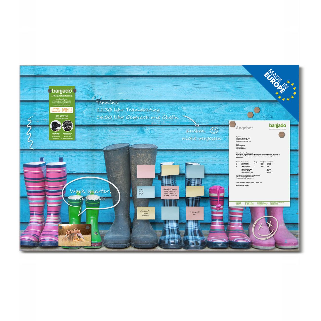 Ein Stück Design, das Ihren Alltag organisiert. Schreiben, heften, inspirieren - alles an einem Ort. Qualität, die man spürt. Montage leicht gemacht. Handwerk mit Herz - veredelt in Sachsen. Einzigartiges Design mit Motiv Motiv Gummistiefel Beschreibbare Glasoberfläche, leicht zu reinigen Starke Magnetkraft durch Stahlrückwand Inklusive 4 Neodym-Magneten Flexible Montageoptionen Handveredelt in Sachsen - Qualität, die bleibt