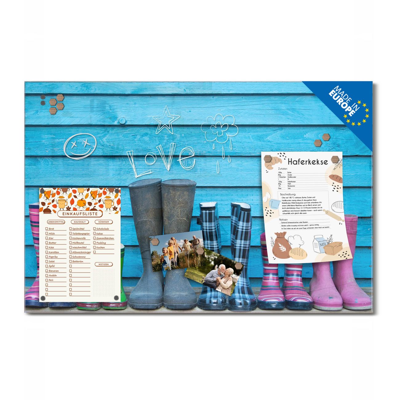 Ein Stück Design, das Ihren Alltag organisiert. Schreiben, heften, inspirieren - alles an einem Ort. Qualität, die man spürt. Montage leicht gemacht. Handwerk mit Herz - veredelt in Sachsen. Einzigartiges Design mit Motiv Motiv Gummistiefel Beschreibbare Glasoberfläche, leicht zu reinigen Starke Magnetkraft durch Stahlrückwand Inklusive 4 Neodym-Magneten Flexible Montageoptionen Handveredelt in Sachsen - Qualität, die bleibt